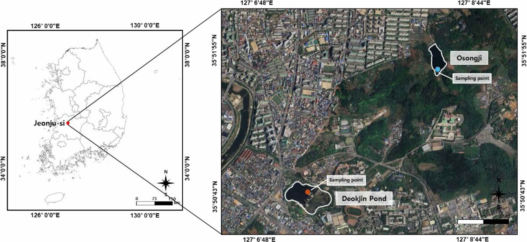 연구지역으로는 소규모의 수계를 대표할 수 있으면서 주변 환경의 차이에 의해 지표수 수질의 영향이 다르게 나타날 수 있는 소규모 저수지 두 곳을 선정하였다. 연구지역으로 선정된 오송지와 덕진연못은 전북특별자치도 전주시 덕진구에 위치하고 있는 소규모의 수계이다(Fig. 1). 오송지는 완만한 구릉으로 둘러싸여 있고 그 주변에는 과수원이 위치하고 있다(Lee et al., 2019). 반면, 덕진연못은 전북대학교 내에 위치하고 있고 자연속에 위치한 오송지에 비해 도심에 둘러싸여 있다. 이러한 위치의 차이로 인해 두 수계는 주변 환경과 지표수의 유입과 유출의 형태가 다르다.