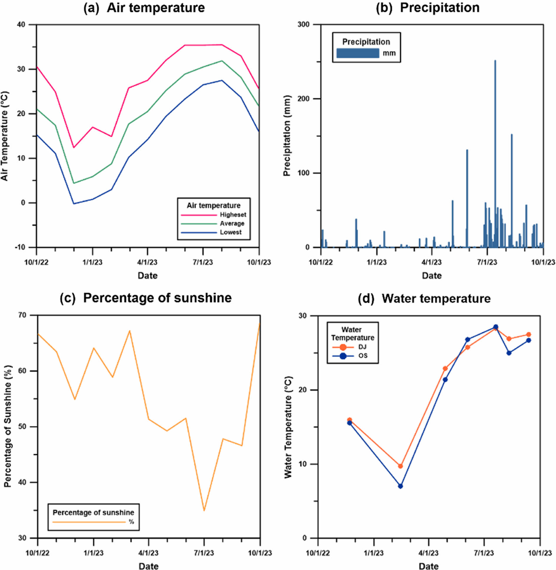 Fig. 2 Weather data for Jeonju-si from the Korea Meteorological Administration (KMA) Weather Data Service (data.kma.go.kr) and water temperature measured during the investigation period as part of this study: (a) air temperature, (b) precipitation, (c) percentage of sunshine, and (d) water temperature. |