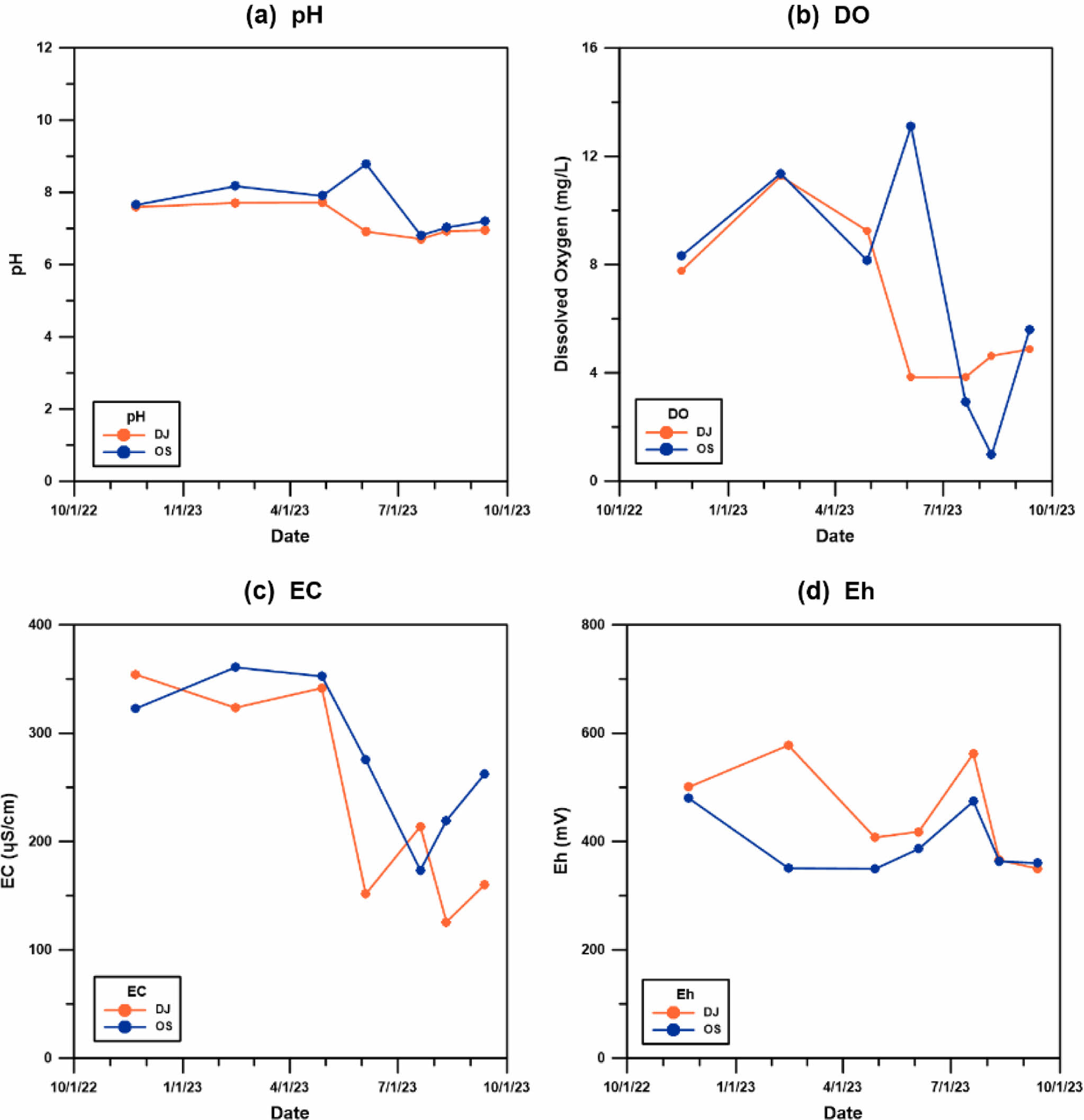Fig. 3 Water quality indicators measured in the field at Deokjin Pond and Osongji: (a) pH, (b) dissolved oxygen (DO), (c) electrical conductivity (EC), and (d) Eh. DJ and OS represent Deokjin Pond and Osongji, respectively. |