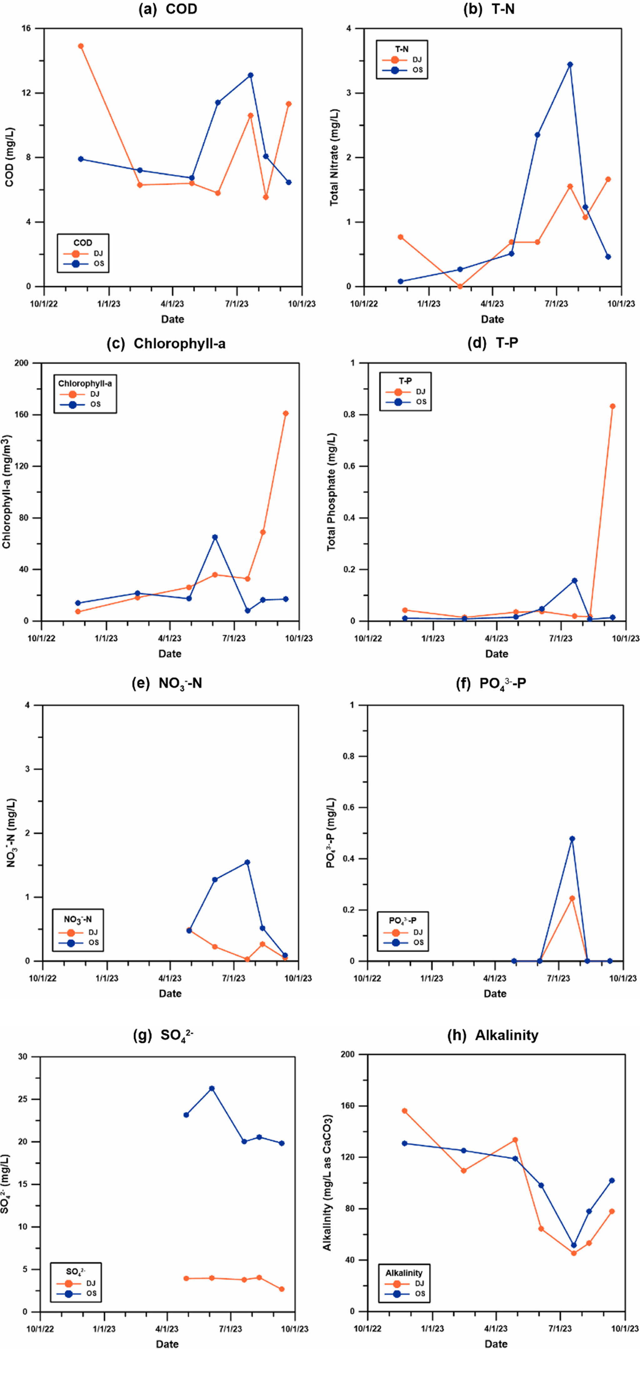Fig. 5 (Continued): (g) sulfate (SO42− ) and (h) alkalinity. DJ and OS represent Deokjin Pond and Osongji, respectively. |