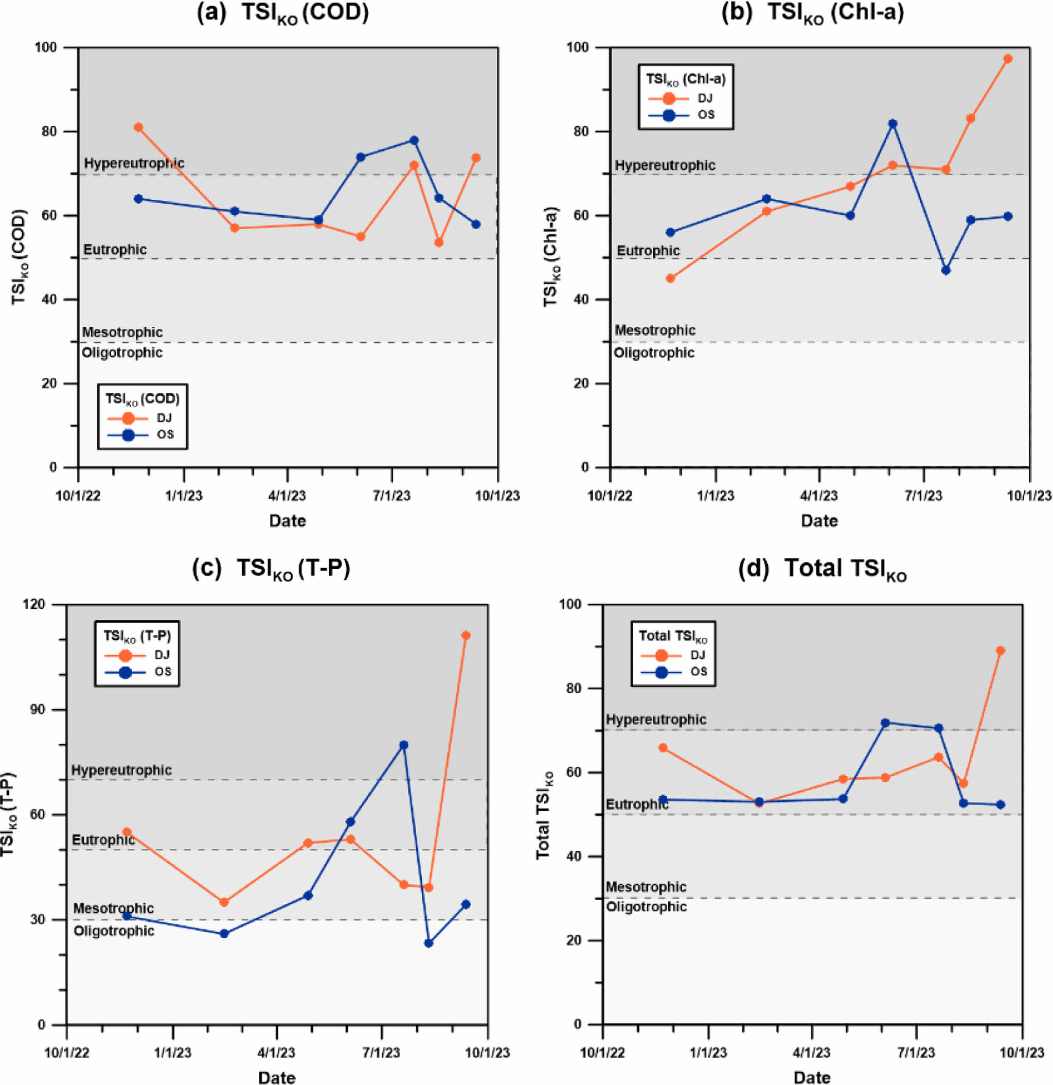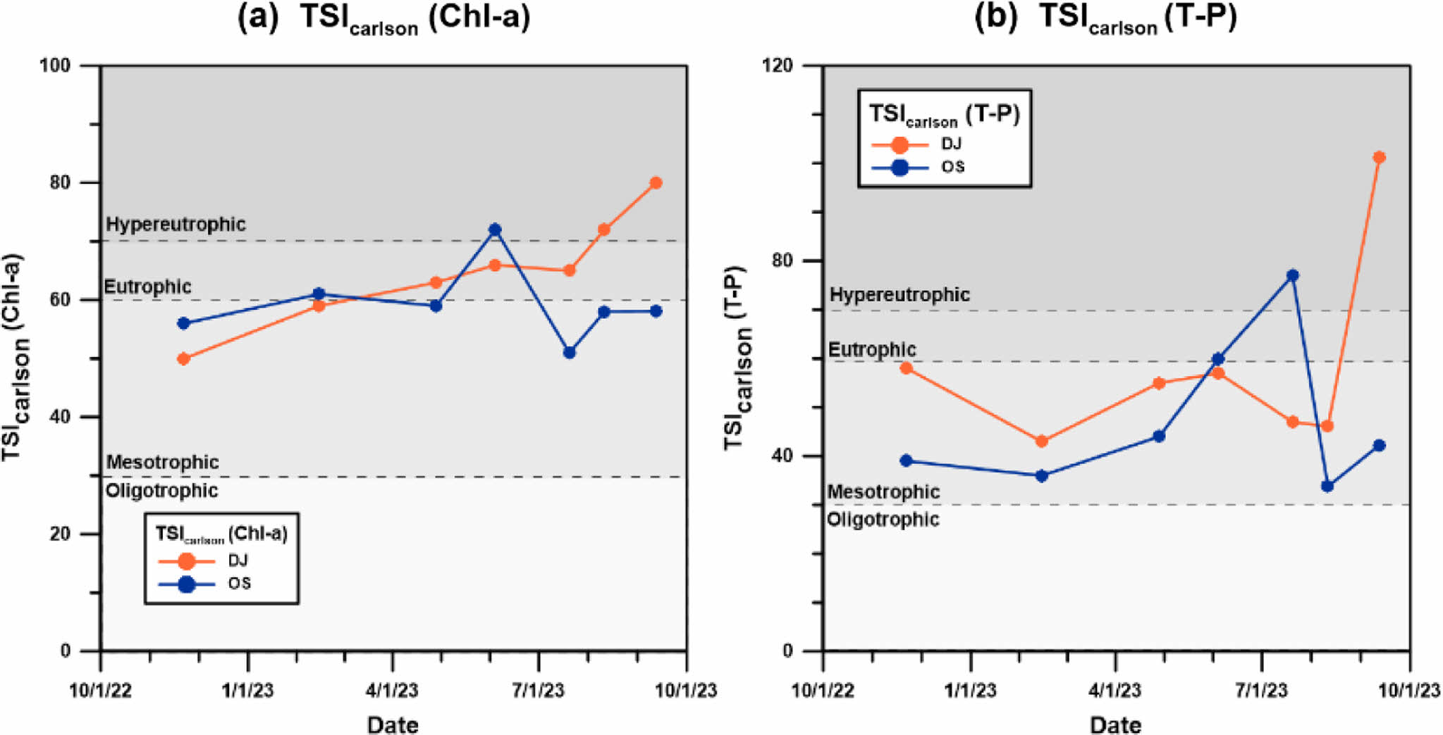 Fig. 6 Carlson’s Trophic State Indices by chlorophyll-a and T-P: (a) TSICarlson(Chl-a), calculated from chlorophyll-a (Fig. 4c) and (b) TSICarlson(T-P), calculated from T-P (Fig. 4d). DJ and OS represent Deokjin Pond and Osongji, respectively. |