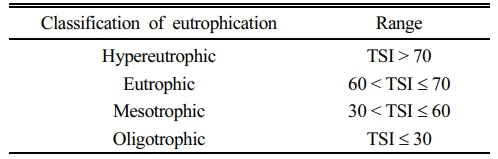 Carlson(1977)은 호소의 영양상태를 정의하고 부영양화를 분류하기 위한 방법으로 Trophic State Index(TSI)를 제시하였는데, 본 연구에서도 이 지수를 사용하였다. TSI는 아래와 같이 chlorophyll-a, T-P, 투명도(Secchi disk; SD)를 고려하며, 조류를 제한하거나 변수에 영향을 미치는 요인과 관련된 변수 간의 상호 관계를 이용한다(Carlson and Simpson, 1996). Chlorophyll-a와 SD는 조류의 생물량을 추정할 수 있으며, T-P와 T-N은 영양염류의 부하와 영양상태와 연관이 있어 변수들은 서로 연관성을 가지고 있다(Carlson, 2007). 영양상태를 0부터 100까지의 수치로 나타내고 이 지수가 10씩 증가함에 따라 투명도가 1/2로 감소하여 투명도가 64일 때 TSI가 0인 것으로 한다(Carlson, 1977). Chlorophyll-a, T-P, SD를 적용한 TSI는 계산한 변수가 30 이하일 때 빈영양호(oligotrophic)로 하며, 30 초과 60 이하를 중영양호(mesotrophic), 60 초과 70 이하를 (eutrophic)로 한다. 그리고 70을 초과하는 TSI는 과영양호(hypereutrophic)라고 한다(Table 1).