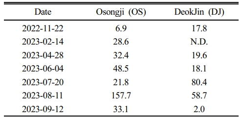 Fig. 4는 채취한 물 시료를 이용하여 실험실에서 측정한 주요 수질 지표들의 분석 결과를 보여준다. COD의 경우 외부에서 비롯된 유기물의 유입을 나타내는 수질 오염 지표이며, T-N 또한 외부에서 유입이 커질수록 값이 커질 수 있다. COD는 오송지의 경우 여름철 강수량 증가로 인해 유입이 증가하였으며 강수량이 적을 때는 상대적으로 낮은 값을 보였다(Fig. 4a). 덕진연못은 겨울철 COD의 값이 매우 높았고, 여름철에도 그 값이 높아지는 것 같이 보였으나 강수량이 줄어든 9월에도 오송지와는 반대로 측정값이 높아졌다. 인공적인 지하수 공급을 받으며 유기퇴적물이 많이 축적된 덕진연못(Choi et al., 2015)의 특성상 외부물질의 유입을 의미하는 COD 값의 편차가 매우 크게 나타났다. 하지만 오송지는 겨울철 보다 여름철에 그 값이 증가하고, 강수량이 적어지는 가을에 그 값이 낮아져 계절에 따른 변화가 뚜렷하게 나타났다. T-N의 경우 오송지와 덕진연못 모두 여름철 COD와 증감의 형태가 비슷했다(Fig. 4b). 이는 강수량의 증가로 인해 외부 물질이 쓸려 유입되어 여름철에 값이 증가한 것으로 추측할 수 있다.