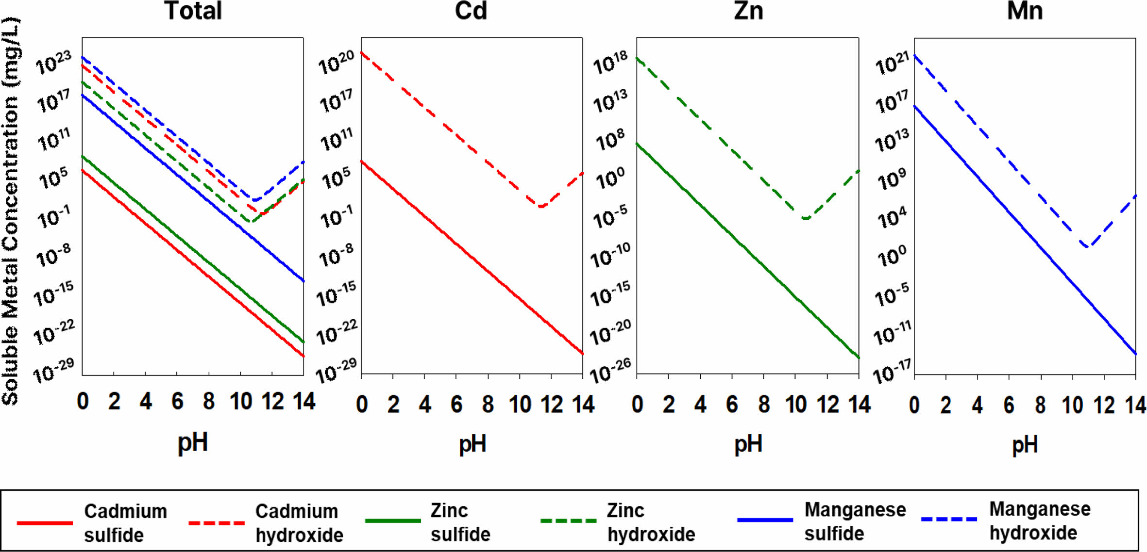 Fig. 1 Comparisons of solubilities for metal sulfides and metal hydroxides as a function of pH. |