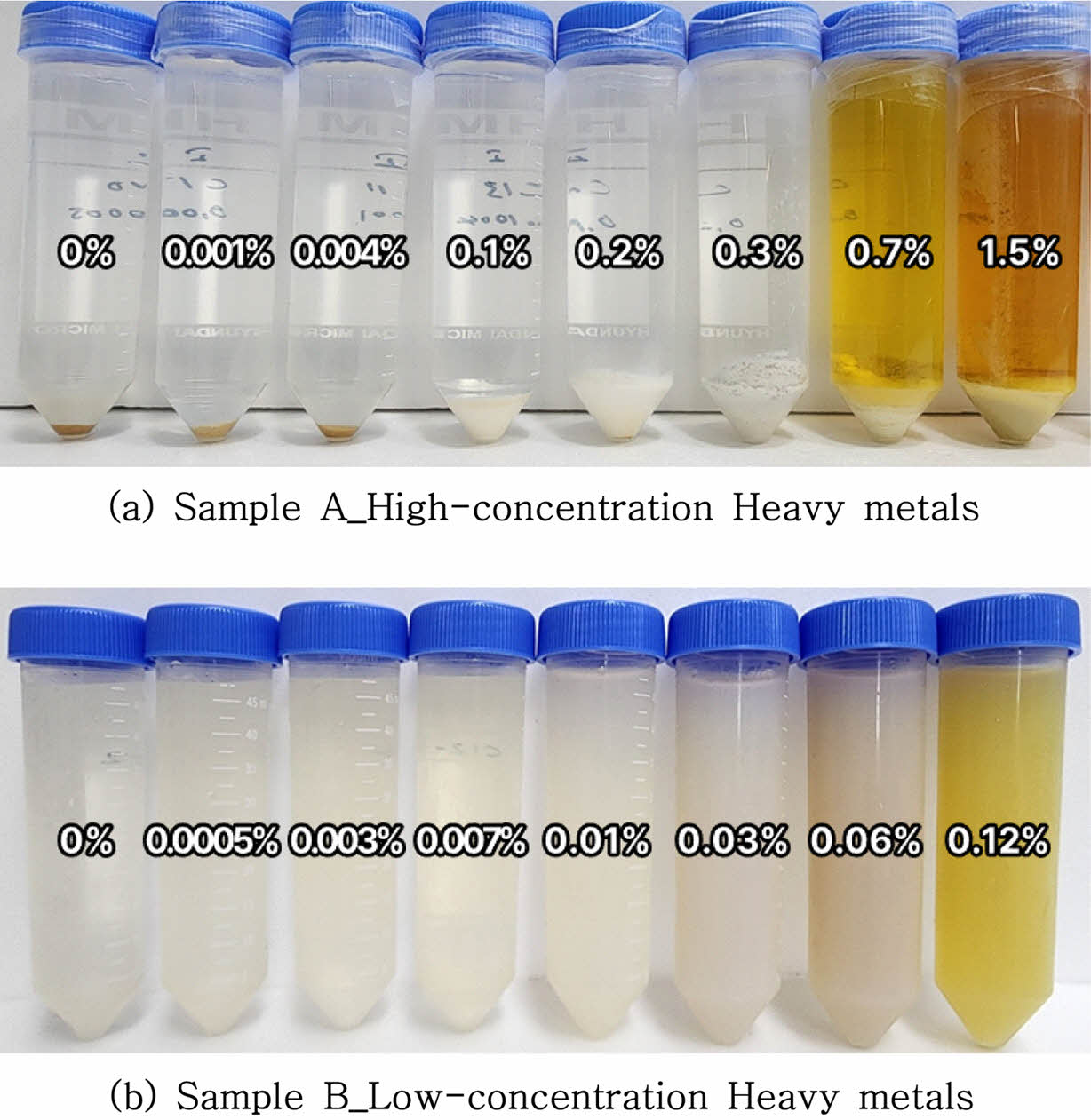 회분식 실험(Batch test)은 50 mL 코니컬 튜브에서 상온(25oC) 조건으로 진행하였다. 29% CPS 용액을 다양한 비율의 초순수로 희석하여 1 ml를 준비하고, 49 mL의 중금속 오염 지하수에 첨가하여 지하수 내 중금속 저감 농도 및 수질 이화학적 특성의 변화를 관측하였다. CPS 주입량은 이전 문헌(Go, 2023; Yoon et al., 2024)에서 조사된 지하수 내 용존 중금속 제거에 필요한 mass ratio (CPS/Heavy metal, w/w)를 기반으로 주입 CPS의 농도 범위(A 지점 0~1.5%, B 지점 0~0.12%)를 산정했으며, 반응조의 전경은 Fig. 3(a), (b)에 제시하였다.