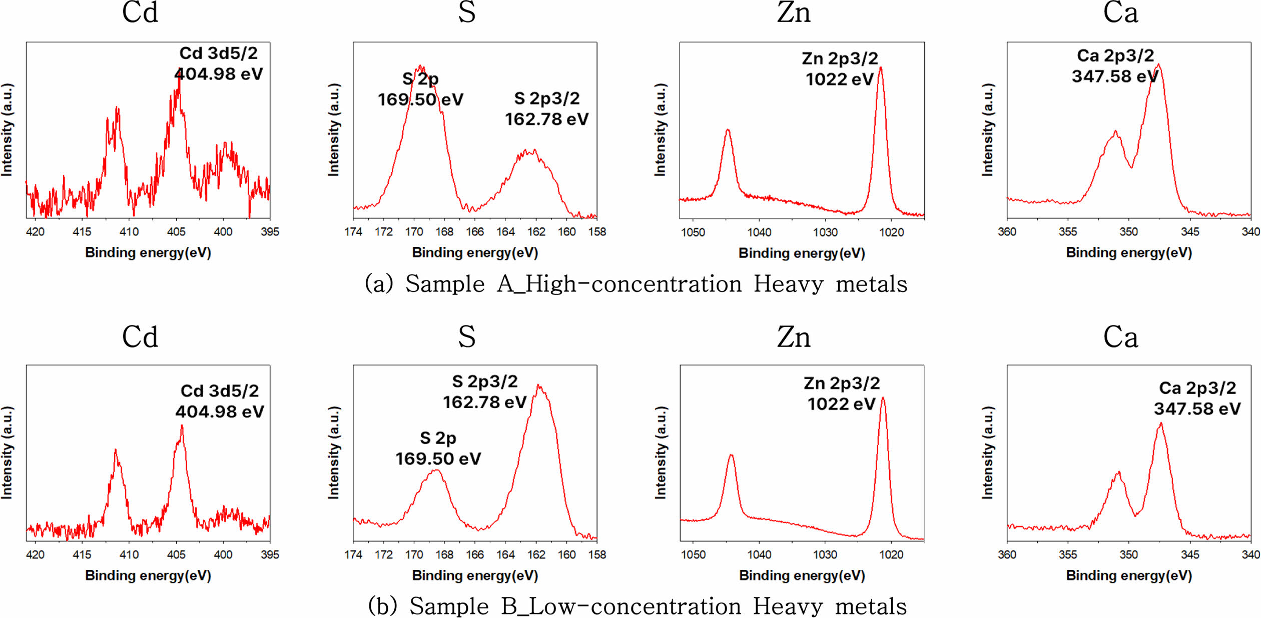 또한 Zn, Cd, Ca 외에도 시료에서 관찰된 다른 peak들에 대한 논의가 필요하다. 예를 들어, O 1s peak (531~532 eV)는 시료 표면의 산화물 또는 수산화물의 존재를 나타낼 수 있으며, 이는 침전물 형성 과정에서 물리적, 화학적 흡착반응과 관련이 있을 수 있다(Dupin et al., 2000; XPS Periodic Table, 2024). 이러한 결과는 침전물 표면에 중금속 황화물(ZnS, CdS)뿐만 아니라 기타 산화물과 황산염 구조가 혼재할 가능성을 나타낸다.
