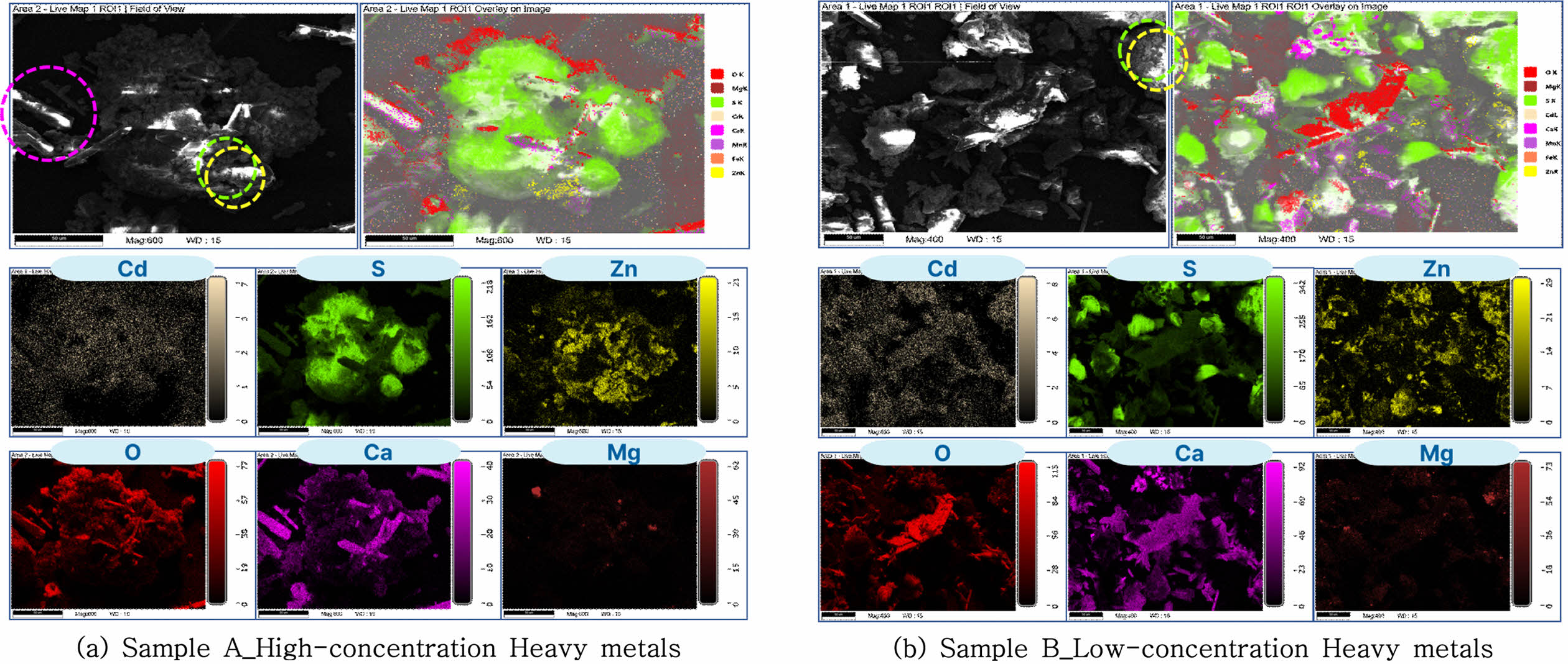 XPS 분석에서 침전물 표면의 화학 상태와 결합 형태를 확인할 수 있었으나, XPS 분석은 표면에서 약 5~10 nm 깊이까지만 분석이 가능하다. 본 연구의 중금속 침전물 시료와 같이 다양한 종류의 중금속 및 결정, 비결정질 물질이 혼합된 복잡한 시료에서는 피크 간 구분이 어려워 정확한 결합 형태를 파악하는 데 한계가 있다(Fantauzzi et al., 2015). 이러한 표면 분석의 한계를 보완하기 위해 SEM-EDS 분석을 활용하여 침전물의 표면에 존재하는 원소 조성과 분포를 파악하였다. SEM-EDS는 X선 검출기를 활용하여 특성 원소의 분포와 농도를 시각화 할 수 있다(Kotula et al., 2023). 따라서 침전물 구성 상태 확인을 위해 SEM-EDS 분석을 진행하였다.