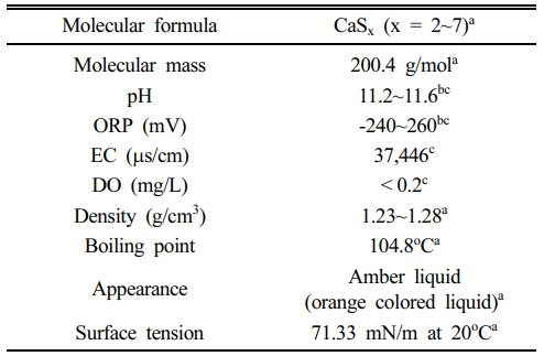 실험에 사용한 Calcium polysulfide (CaSx, CPS) 용액은 오염 토양 또는 폐수 내 중금속 정화를 위해 상업적으로 판매되고 있는 CPS 29% 용액 (Lianyungang YoSoo Industrial Technique Co., China)을 구매해 실험에 사용했다. CPS 용액은 pH (pHCPS = 11.2~11.6)가 매우 높고 산화환원전위(ORPCPS = -240~260)가 매우 낮은 것으로 확인되었다. 또한 물보다 밀도(dCPS = 1.23~1.28 g/cm3)가 큰 것으로 알려져 있으며(EFSA 2010; Dahlawi et al. 2017), 관련 선행 연구에서 보고된 물리화학적 특성을 Table 1에 제시하였다. Fig. 2에 나타난 바와 같이 CPS의 pH 범위에서 CPS 내 용존 상태로 존재하는 황 이온(sulfur ion)은 주로 HS-와 일부 S2-로 구성된다. 실제 현장 지하수 내 적용 시 지하수 내 Me2+와 CPS 내 HS- 및 S2-가 반응해 Metal sulfide 침전물 형태를 구성하는 것으로 알려져있다(Migdisov et al., 2002; Lewis, 2010; Prokkola et al., 2020). 자세한 반응식은 Eqs. (5)~(8)에 제시하였다.