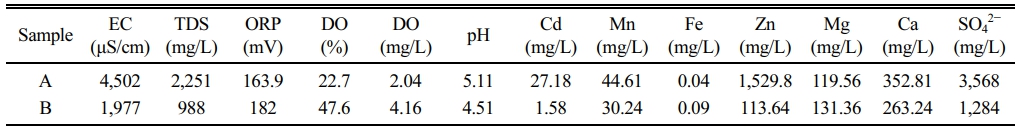 현장 지하수의 수질 이화학적 특성과 중금속 및 황산염 농도를 Table 2에 제시하였다. 지하수 시료의 수질 이화학적 성상은 각 지점마다 상이하였으나, 공통적으로 pH 4.5~5.1 정도의 산성을 띄었으며, ORP (mV)는 163~182 mV 정도의 산화 조건임을 확인하였다. DO (mg/L)는 B 지점에서 다소 높게 나타난 반면, EC (ms/cm)의 경우 A 지점에서 상대적으로 높게 측정되었다. 이러한 DO 및 EC 값의 차이는 두 지점별 지하수 내 중금속 농도의 차이에 기인한 것으로 판단된다. Table 2에 요약된 중금속 농도를 통해 두 지점 간 중금속 농도 차이가 확인되었으며, A 지점에서 Cd가 27.18 mg/L, Zn가 1,529.77 mg/L로 측정되었고, B 지점에서 Cd은 1.58 mg/L, Zn가 113.64 mg/L로 측정되어 두 지점 간 농도 차이가 약 10~15배 이상인 것으로 확인되었다. 따라서 A 지점은 고농도 조건(Sample A), B 지점은 저농도 조건(Sample B)으로 명명하여 실험을 진행하였다.