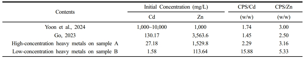 저농도 실험에서 각 중금속(Cd, Zn)의 감소된 중량과 주입된 CPS의 중량의 weight ratio (CPS/Heavy metal, w/w)는 CPS/Cd = 15.88, CPS/Zn = 5.33인 것으로 조사되었다. 본 실험에서 조사된 mass ratio는 이전에 진행된 연구(Yoon et al., 2024)에서 조사된 수치 및 고농도 실험에서 조사된 수치 대비 상대적으로 높은 수치이며, 중금속 침전에 필요한 CPS 주입량 (mg)은 감소했으나 각 중금속 종(Cd, Zn)의 침전에 필요한 CPS/Heavy metal (w/w)의 weight ratio가 증가한 것으로 확인되었다.