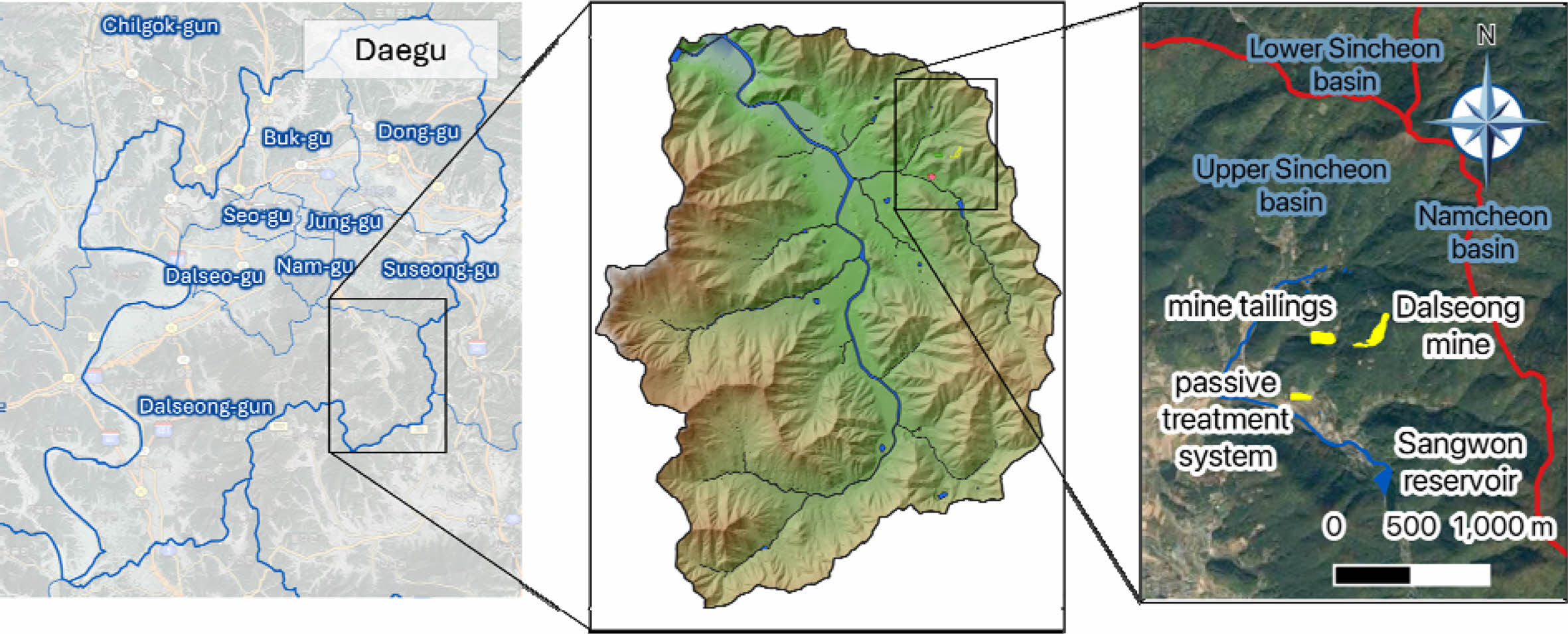 본 연구 지역은 대구광역시 달성군 가창면 상원리에 위치한 달성광산 인근으로, 대구지역 지하수기초조사(MOCT, 2004)에서는 신천상류 유역으로 분류되어 조사가 수행되었던 지역이다. Fig. 1은 본 연구 지역을 나타나고 있으며, 분수령에 해당하는 유역간 경계를 붉은색 실선으로 표시하였다. 그림에서와 같이 연구 지역의 북쪽 및 동쪽에는 각각 신천하류 유역 및 남천 유역이 인접하고 있다. 주요 오염원으로는 달성광산(Dalseong mine), 광미적치장, 달성광산에서 유래한 배출수를 처리하기 위한 자연정화 처리시설(passive treatment system)이 있으며 Fig. 1에서는 노란색으로 표시하였다. 2개의 하천이 달성광산의 남쪽과 북쪽에서 연구 지역의 서쪽으로 흘러가며, 남쪽 하천의 상류에는 저수지(Sangwon reservoir)가 있다. 하천 및 저수지는 Fig. 1에서 파란색으로 표시하였다.