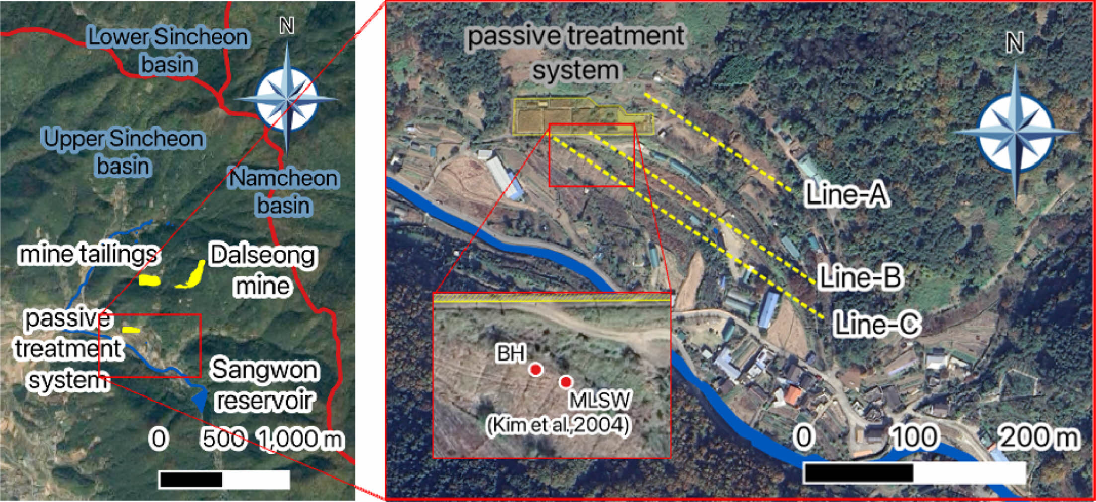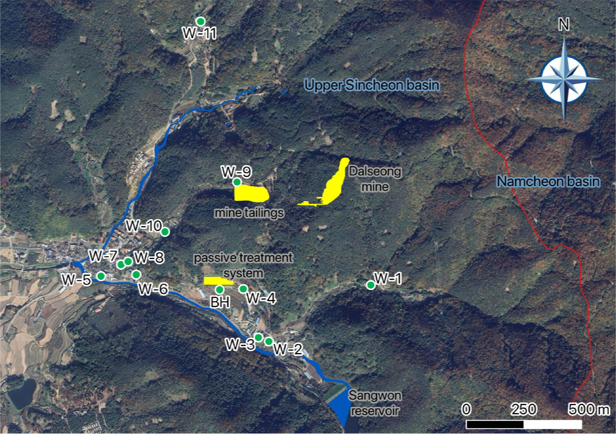 Jung(1996)은 달성광산 인근의 하상 퇴적물 분석을 통해 산성 광산 배수에 의한 오염 정도를 조사하여 오염 원인을 규명하고자 하였고, Lee et al.(2003)과 Choo et al.(2007)은 수리지구화학적 연구를 수행하여 해당 지역에서 폐석 침출수 및 갱내 유출수로 인한 오염이 정화시설에서 거의 정화되지 않고, 슈베르트마나이트(schwertmannite)의 침전이 오염 농도의 감소에 영향을 미칠 수 있음을 제시하였다. 최근 Kim et al.(2020)은 황산염의 동위원소 및 아연과 카드뮴의 비율(Zn/Cd)을 이용해 달성광산 주변에서 토양 및 지하수 오염의 주요 원인이 광미(mine tailings)임을 확인하였고, 후속 연구(Kim et al., 2023; Kim et al., 2024)에서는 구리, 납, 아연, 황 및 산소 동위원소 분석을 통해 오염원과 오염 메커니즘을 규명하고자 하였다. 오염 정화 또는 오염 저감을 위한 노력으로 1996년 산성 광산 배수 처리를 위한 반응조 시스템이 실험적으로 운영·평가되었고(Cheong et al., 1998), 1998년에는 5개의 소택지로 구성된 자연정화 처리시설이 설치되어 현재까지 운영되고 있다(Lee et al., 2003). 이와 더불어, 2012년부터 2015년까지는 슬래그 반응조를 적용한 정화 실험이 진행된 바 있다(MIRECO, 2015; Kim et al., 2018; Kim et al., 2021).