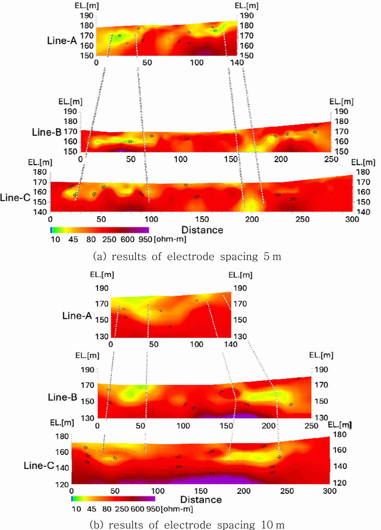 전기비저항 탐사기법 중 하나인 쌍극자 기법을 3개 측선에 대해 5 m 및 10 m의 전극 간격으로 수행하여, 충적층 및 암반층에서의 개략적인 지하수 유동 경로 및 심도를 파악하고자 하였다. 연구 지역 내 전기비저항탐사 측선은 Fig. 2에 노란색 점선으로 표시하였으며, 측선별 탐측 결과는 Fig. 3에 도시하였다.