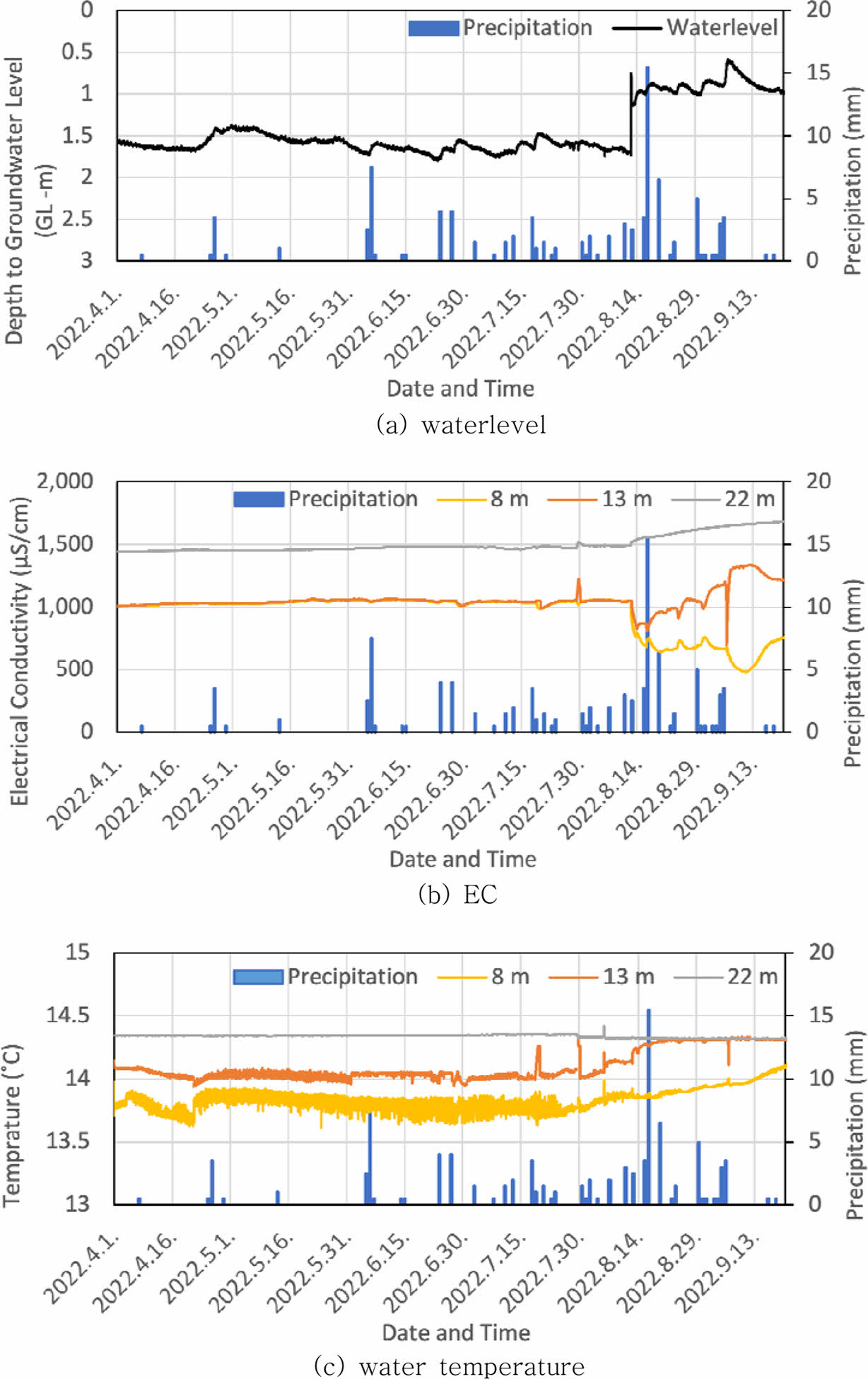 총 25 m 깊이 중 유공관의 범위는 지표하 5~25 m까지이며, 대수층의 발달 정도와 관측정 설치 후 초기 전기전도도(EC) 수직분포를 고려하여 지하수 유동 심도로 판단되는 8 m, 13 m, 22 m 각각에 Schlumburger사의 CTD-diver를 설치하고, 관측정 보호시설 내부의 지표면에 Schlumburger사의 BARO-diver를 설치하였다(Fig. 4 참조). 2022년 1월 24일부터 동년 9월 21일까지 10분 간격으로 지하수의 수위, 수온 및 EC를 자동 관측하였으며, 그 결과는 Fig. 5와 같다.