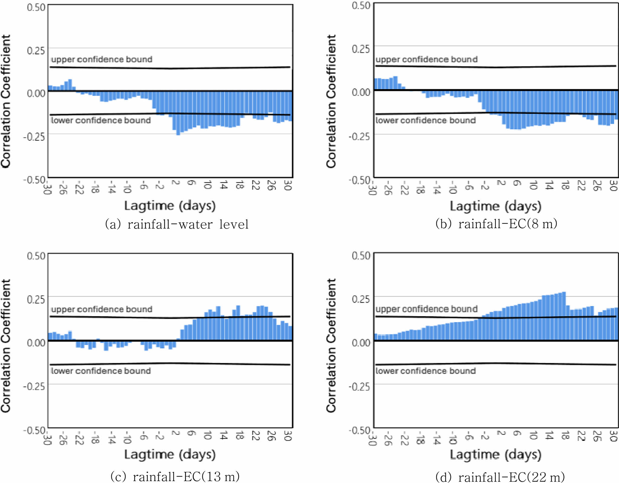 강수와 심도별 EC에 대해 교차 상관분석을 수행한 결과, 8 m 심도의 경우(Fig. 6(b) 참조) 시차가 5~6일일 때 가장 높은 음의 상관성을 보인다. 이는 지표 인근 심도임을 고려할 때 강수 유입으로 인한 희석으로 EC가 낮아짐을 의미한다. 13 m 및 22 m 심도의 경우(Fig. 6(c) & 6(d) 참조) 17일에 가장 높은 양의 상관성을 보이고 있는데, 이는 강수로 인해 오염 물질의 유입이 증가하였음을 나타낸다. 또한 시차의 차이를 보이는 이유는 8 m 심도의 경우 관측정 부근 상류에서의 함양에 의한 것이며, 13 m 이하에서는 배후지 상류에서의 함양에 의한 효과를 지시한다.