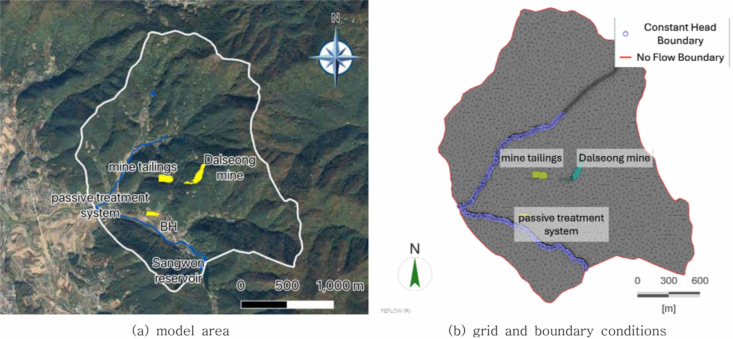 달성광산을 중심으로 반경 약 1 km의 구역을 포함하도록 유역 경계에 해당하는 능선을 따라 Fig. 8(a)와 같이 모델 영역을 설정하였다. 격자는 삼각망을 활용하여 작성하였으며, 하천, 광산, 광미적치장 및 관측 지점과 같은 관심 대상에 대해서는 더욱 세밀하게 격자를 구성하였다. 모델 영역의 측면 경계는 배수 분지의 능선을 따라 설정하였으므로 무흐름 경계로 간주하였다. 영역 내부의 남쪽 하천은 상원지로부터 물이 공급되어 수위가 일정하게 유지되고, 북쪽의 하천 또한 현장 조사시 수위가 일정하게 유지되는 것을 확인하였으므로, 제1형 고정 수두 경계(Dirichlet boundary)를 설정하였다(Fig. 8(b) 참조). 모델 보정에 활용한 지하수위 관측 자료는 갈수기에 해당하며, 하천 수심 또한 깊지 않으므로 하천 수위는 하천 지형 고도와 동일하게 설정하였다. 수직적으로는 총 14개의 층으로 모델을 구성하였는데, 1~4층은 각각 5 m 두께로, 5~13층은 갱도 간의 고도 차이(MIRECO, 2016)를 고려하여 20 m 두께로 설정하였으며, 모델의 바닥 경계는 EL.-60 m의 평면을 가정하였다.