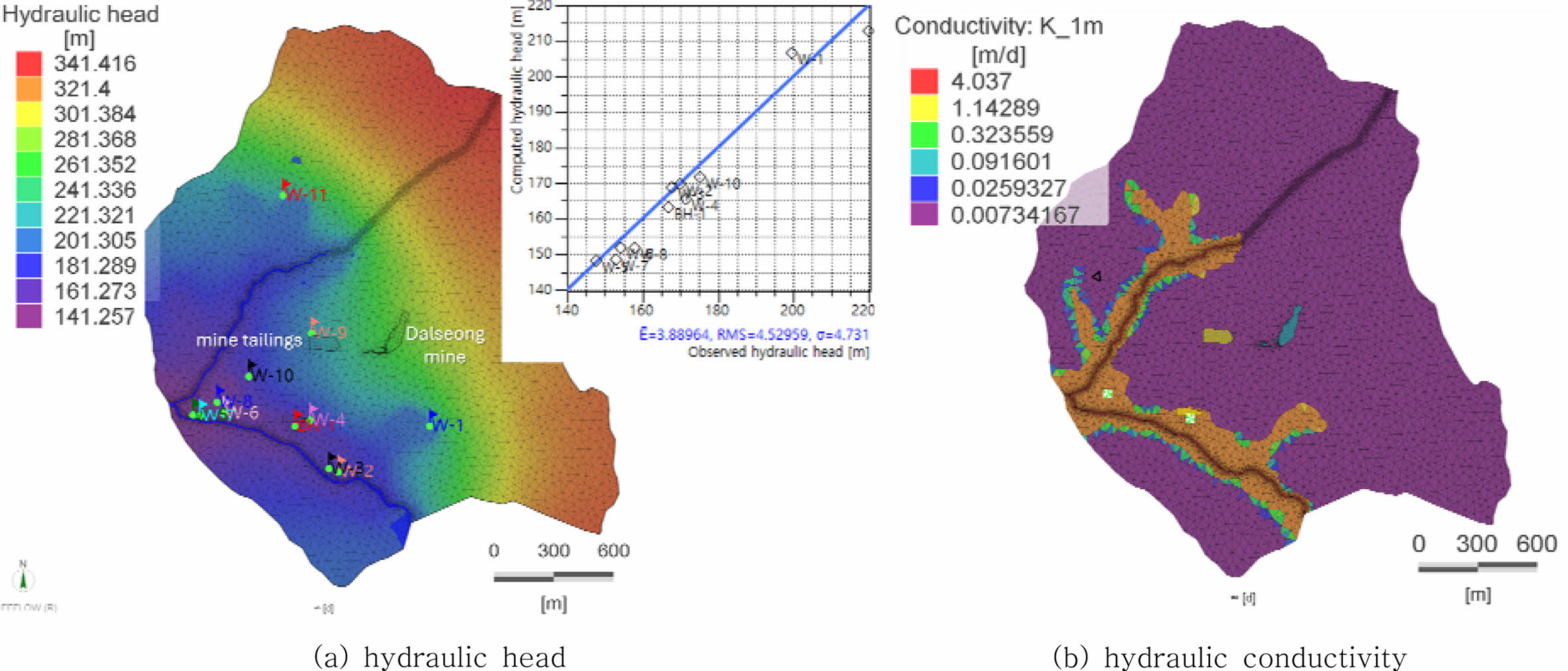 모델의 보정을 위해 Table 1의 실측 수위와 수치 모의를 통해 얻은 계산 수위가 근사해질 때까지 대수층의 수리 전도도를 반복적으로 변경하는 시행 착오법을 수행하였다. 최종 결과에 대한 RMSE가 4.53으로 산정되어 보정이 적절히 이루어졌음을 확인하였다. 보정 완료된 최종 수리 수두 분포 및 관측 수두와 계산 수두의 산점도는 Fig. 9(a)와 같고, 보정 완료 후 수리 전도도 분포는 Fig. 9(b)와 같다. 1~4층까지는 0.007342~4.037 m/d, 5~14층은 0.007342 m/d의 단일 값으로 보정되었다.