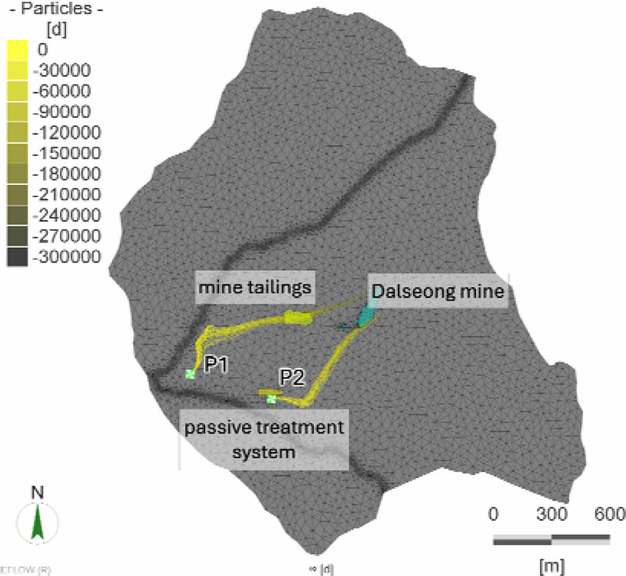 Jung(1996), MIRECO(2016), Kim et al.(2020) 등의 여러 문헌을 살펴보면, 연구 지역 내 많은 위치에서 오염이 보고되고 있다. 따라서, 오염이 보고된 지점 중 하류 2곳을 설정하여 오염이 유래한 경로를 알아보고자 하였다. 첫 번째 지점(P1)은 두 하천 사이의 합류부 부근이며, 두 번째 지점(P2)은 자연정화 처리시설 인근에 위치한다(Fig. 10 참조). 역추적 결과 P1 지점에서 관측된 오염은 광미적치장에서 유래하고, P2 지점에서의 오염은 달성광산에서 유래했을 가능성을 보인다.