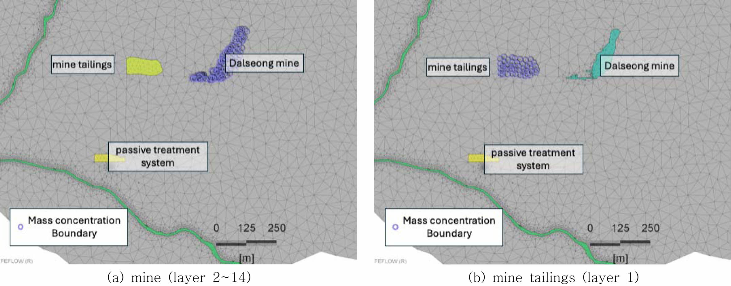 광산 배수 및 광미 침출수가 대수층으로 유입되는 것을 모의하기 위해 흡착, 지연, 분해 등 자연 저감의 영향을 받지 않는 임의의 오염 물질을 가정하여 오염원으로 설정하였다. 광산에 대해서는 광산 면적의 전체 층에 걸쳐서 오염원을 설정하였으며, 광미적치장에 대해서는 지표에 오염원이 위치하는 것으로 설정하였다. 각 해당 오염원의 위치는 Fig. 11의 파란색 원과 같다. MIRECO(2016)에 따르면 EC와 오염물 농도 사이의 선형적인 상관관계가 존재한다. 하지만, 절대적인 오염원 농도에 대한 정보가 부재하여 본 연구에서는 MIRECO(2016)에서 보고된 달성광산 지역 내 최대 EC 측정값인 2,400 μS/cm를 2,400 mg/L로 가정하여 적용하였다. 분산지수는 Zech et al.(2015)와 Schulze-Makuch(2005)를 참조하여 최대 종분산지수 10 m, 최소 종분산지수 1 m, 최대 횡분산지수 1 m, 그리고 최소 횡분산지수 0.01 m로 설정하였다. 1974년 달성광산이 휴광한 이후 오염 유출이 시작되었다고 가정하여, 총 50년이 경과한 시점에서의 오염 분포를 모의하였다.