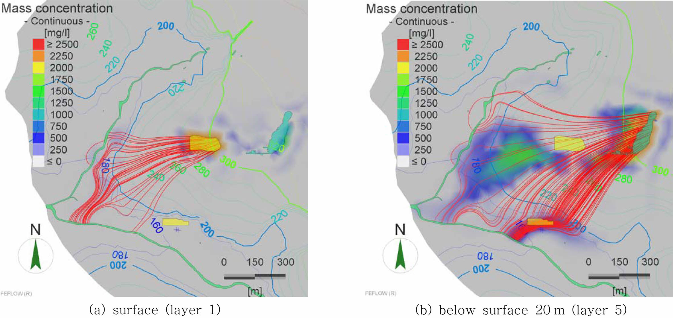 Fig. 12는 오염 거동 모의 결과를 지표 및 지표하 20 m 심도에 대해 평면적으로 나타낸 그림이다. 지표 인근(Fig. 12(a))에서는 광미적치장에서 유래한 유선은 대다수가 남쪽 하천의 하천 합류부 인근으로 향하고, 광미적치장 인근에서 상대적으로 오염 물질이 고농도로 모의되었다. 지하 20 m(Fig. 12(b))에서의 일부 유선은 광미적치장을 지나는 경우 지표 인근의 유선과 유사하게 연장되어 남쪽 하천의 합류부로 향하고 있고, 그 외의 대다수 유선은 자연정화 처리시설을 경유하여 남쪽 하천으로 향하고 있다. 오염 물질의 분포 또한 광산 주변, 광미적치장 하류, 자연정화 처리시설 주변에서 상대적으로 주변보다 높은 농도를 보인다.