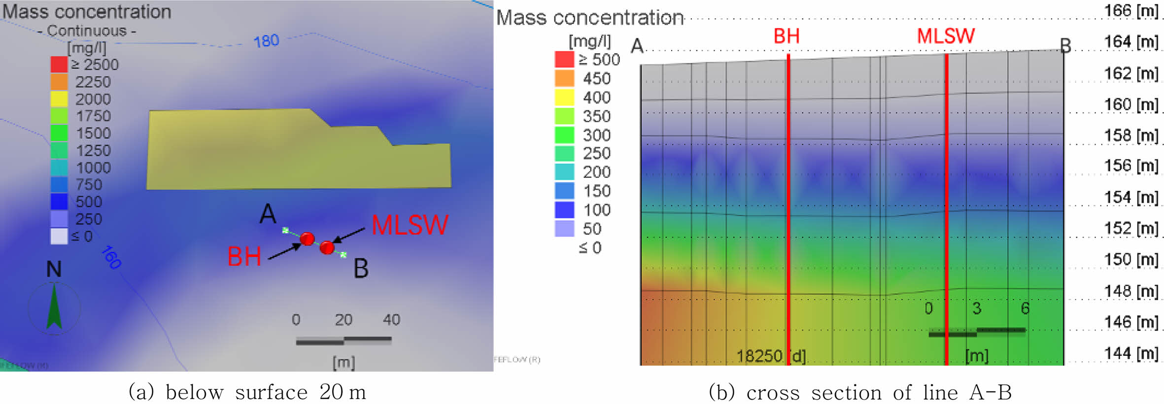 Fig. 13은 관측정 인근에서의 용질 이송·확산 모의 결과를 상세히 표현한 그림이다. Fig. 13(a)는 지표로부터 20 m 아래(5층) 관측정 인근에서의 용질 이송·확산 모의 결과를 나타낸 것이다. 오염은 동쪽에서 서남쪽으로 자연정화 처리시설과 그 남쪽의 관측정(BH) 사이를 가로질러 분포한다. Fig. 13(b)는 BH와 MLSW 두 관정을 지나는 Fig. 13(a)의 선분 A-B를 따른 단면도로, 단면 좌하단의 지표하 20 m 부근에서 오염 물질의 농도가 더욱 높게 분포하는 것으로 모의되었다. 이러한 모의 결과를 고려할 때, BH와 자연정화 처리시설 인근 지표하 20 m 부근에서 오염 물질의 주요 이동 경로일 가능성이 높다고 할 수 있다.