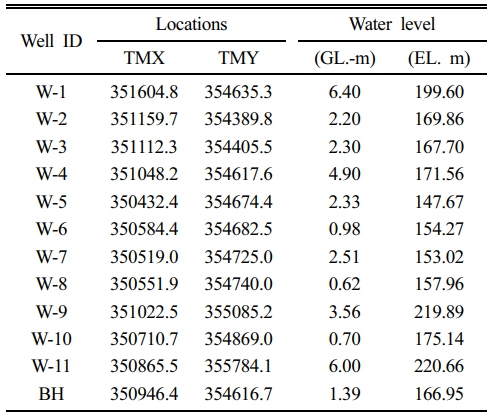 연구 지역 내에 위치한 지하수 이용 시설 중 조사가 가능한 11개소 및 관측정 1개소에 대해 2022년 4월 21일 하루 동안 지하수위를 측정하고, 지하수 이용 여부를 확인하였다. 지하수위 측정 위치 및 수위 측정 결과는 Fig. 7 및 Table 1과 같고, 연구 지역 내 양수 현황이 없음을 확인하였다. 측정된 지하수위는 모델 보정에 활용하였다.