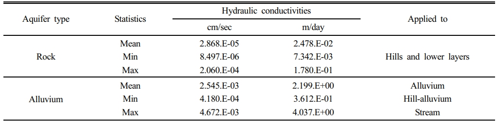 대구지역 지하수 기초조사 보고서(MOCT, 2004)에 따르면, 신천상류 유역 내 연구 지역의 대수층은 크게 암반층과 충적층으로 구분되며, 해당 유역의 암종별 수리 전도도는 Table 2와 같이 정리할 수 있다. 각 층별 수리 전도도의 평균 값을 모델의 초기 수리 전도도 값으로 설정하였다.