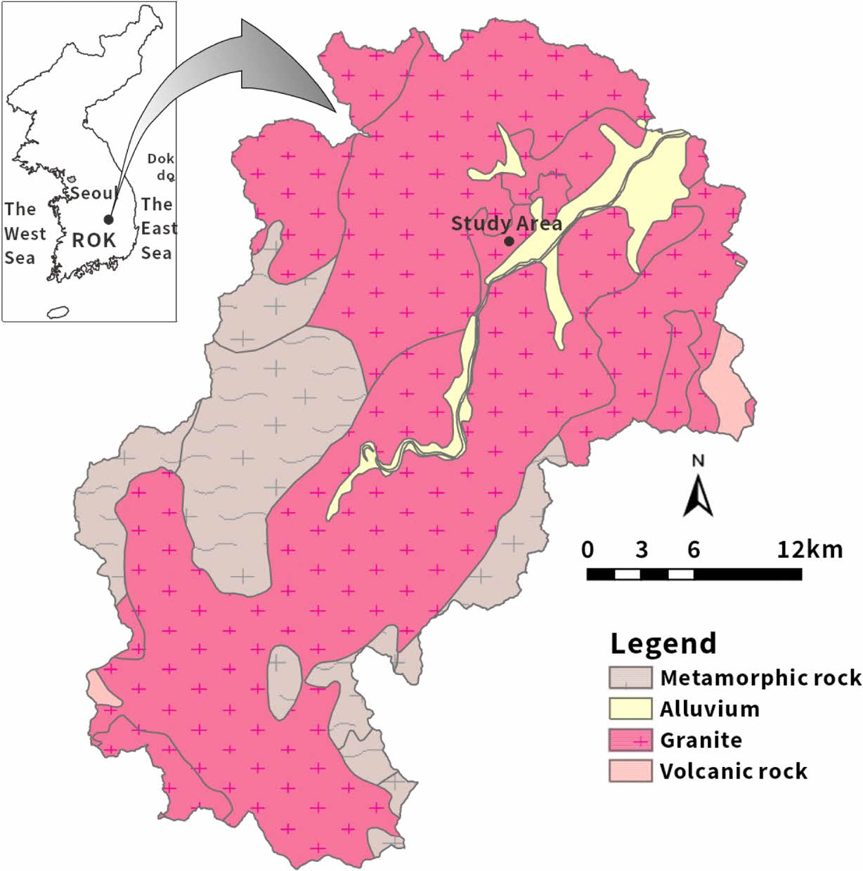 연구 부지는 산업단지 내 위치하고 있으며, 주변으로 공장들이 밀집해 있다. 조사지역 주변의 지형은 대체로 북동에서 남서방향으로 완만한 경사를 이루고 있고 주변으로 산지 또는 구릉지가 존재하며, 고도가 낮은 평지가 발달한 지역에 자리 잡고 있다. 지질은 중생대 쥐라기 화강암과 신생대 제4기 충적층이 분포하고 있다. 화강암은 조사지역 및 그 주변으로 넓게 분포하고 있으며, 충적층은 조사 지역 주변으로 낮은 저지대 또는 하천 주변 지역을 따라 분포한다(Fig. 1).