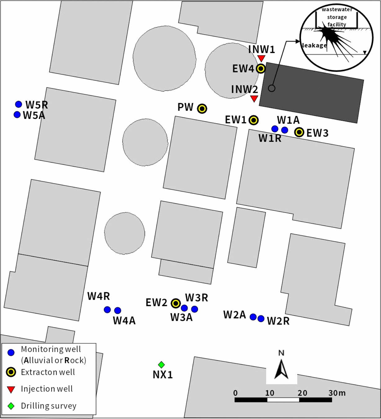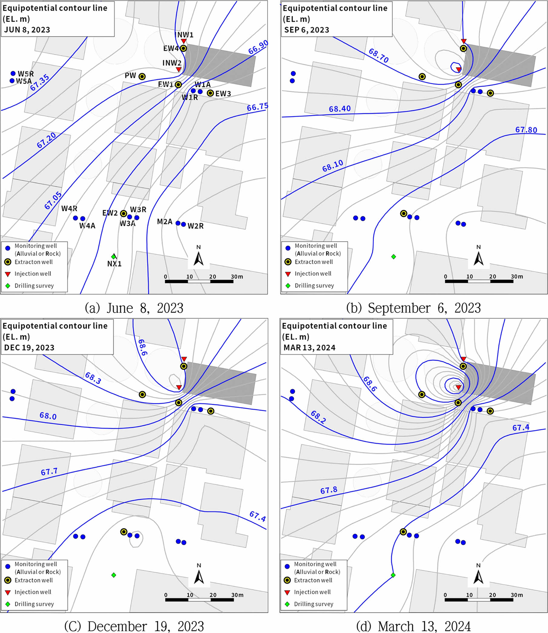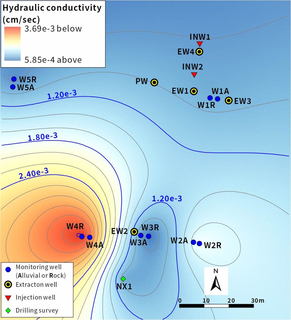 긴급확산방지 조치는 Fig. 5의 공간적 수리전도도의 분포를 고려해서 설치/운영 계획을 마련하였다. 우선 W1R 주변 폐수저장시설에서 유출된 오염물질을 최대한 많이 추출할 수 있는 양수정 EW1, EW3, EW4를 운영하였다. 그리고, 수리전도도가 낮은 지역 W4R 주변으로 더 이상 확산되지 않도록 수리벽체(hydraulic barrier)를 형성하는 양수정 EW2를 운영하였다.