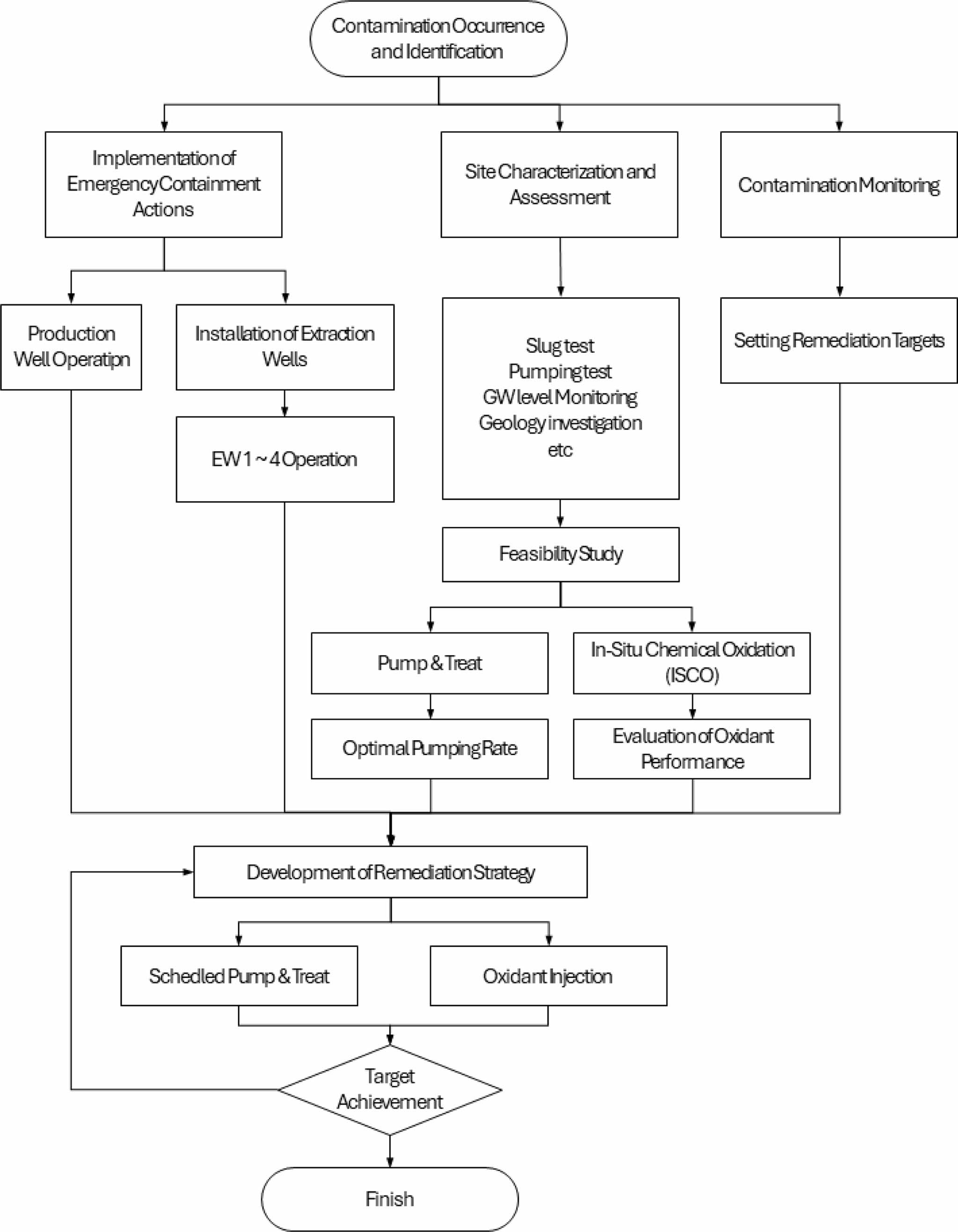 지하수 정화전략은 초기 단계에서 긴급확산방지, 현장 특성 평가, 그리고 모니터링으로 구분되어 진행되었다(Fig. 3). 오염 확산을 최소화하기 위한 긴급확산방지 조치가 먼저 시행되었으며, 이후 현장 특성 평가를 통해 지하수의 오염 원인과 확산 범위, 지질 및 수리학적 특성 등을 자세히 분석하였다. 이를 바탕으로 지속적인 모니터링이 이루어졌고, 수집된 데이터는 정화 전략 수립에 중요한 역할을 했다. 이러한 정화 전략은 현장의 특성과 오염물질의 발생 위치에 맞게 적용되었으며, 이후 장기적인 모니터링을 통해 정화 효과를 평가하고 추가적인 조치를 취하는 방향으로 진행되었다.