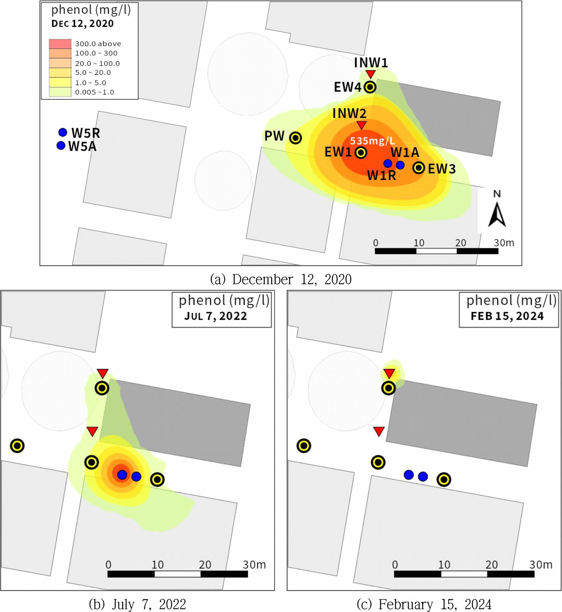연구 부지의 오염은 EW1, W1R 주변에 있는 폐수 저장시설에서 시작되었다. 오염발생 초기인 2020년 12월 오염도(Fig. 8(a))에서 페놀이 535 mg/L 농도로 확인되었다. 오염발생 주변에 설치된 양수정 최대 능력으로 가동하여, 초기의 오염 지하수가 확산되지 않도록 조치하였다.