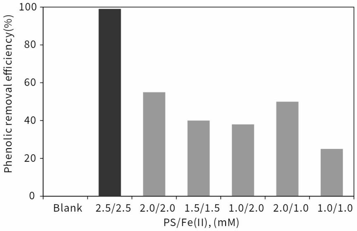 먼저, 실내 실험에 사용된 오염물질은 페놀 혼합물(농도: 7.13 mg/L)로, 다양한 과황산염과 Fe2⁺ 농도를 설정하여 실험을 진행하였다. 구체적으로, 과황산염과 Fe2⁺의 주입 농도는 2.5/2.5 mM, 2.0/2.0 mM, 1.5/1.5 mM, 1.0/2.0 mM, 2.0/1.0 mM, 1.0/1.0 mM의 6가지 조건으로 설정하였다. 각 조건에서 60분간의 배치(batch) 실험이 수행되었으며, 실험 중 pH 제어는 이루어지지 않았다(초기 pH = 8.01). 실험 후, 페놀 혼합물의 제거율은 GC-MS 분석을 통해 평가되었고, 최적의 과황산염과 Fe2⁺ 조합을 도출하기 위해 각 농도 조건에서 제거율을 비교하였다.