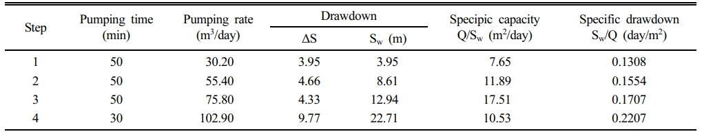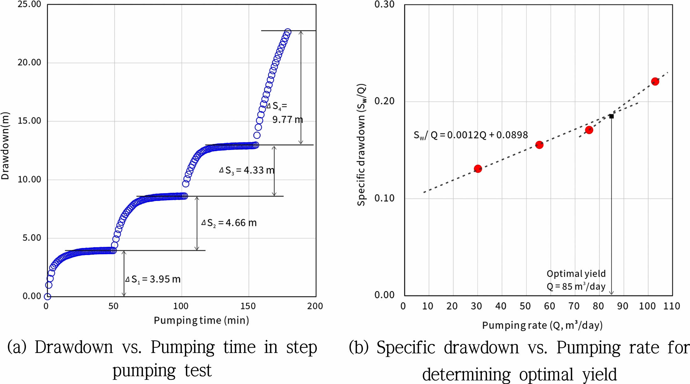 양수처리 공법을 계획하기 위해서는 지하수 고갈, 오염물질 유입 등과 같이 대상 지역의 대수층 내에서 지하수 장해를 일으키지 않는 범위에서의 영향반경이 발생하도록 양수정에서 지하수위 강하를 가능한 범위 내에서 최대한 크게 하였을 때의 적정양수량을 설정해야 한다. 과잉 양수가 이루어지면, 양수정에서의 지하수 고갈, 지하 수위강하로 인해 지속적인 양수의 어려움으로 효율적인 정화를 하지 못하기 때문이다. 적정양수량을 산정하기 위해 현장에서 단계양수시험을 수행하였다. 단계양수시험은 일정한 시간 간격으로 양수량을 증가시켜 가며 관측정의 수위 변화 혹은 수위강하를 관측함으로써 수리상수(투수량계수, 저유계수)와 함께 관정의 효율 및 생산성을 평가할 수 있다(Dawson and Istok, 1991; Hantush, 1964; Kruseman and de Ridder, 1991; Han, 1998). 수위 강하량과 양수량과의 관계식(Jacob, 1947, Sw = BQ + CQ2, S: 수위강하량, Q, 양수량, B & C : 손실계수)을 통해 양수정에서 운영 가능한 양수량을 예측할 수 있다. 혹은 단계별 비수위강하량과 양수량의 그래프를 통해 평형 관계가 무너지는 한계양수량을 통해서 적정 양수량을 추정할 수 있다. 본 연구에서 두 번째 방법을 통해 적정양수량을 산정하였다.