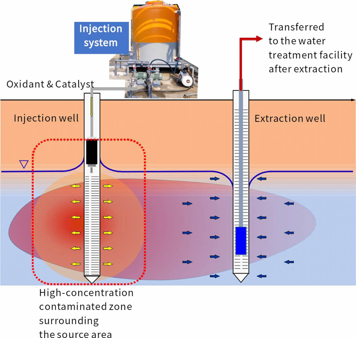 2023년 7월부터는 화학적 산화 공법과 양수처리 공법이 복합적으로 적용되었다. Fig. 12에 복합 적용 개념도를 나타내었다. 오염원이 인접하고 오염도가 상대적으로 높은 지역에서 화학적 산화 공법을 적용하였다. 왜냐하면, 대수층 공극에 잔류하는 오염물질을 양수로 추출하는데 한계가 있기 때문에 화학적 산화제를 주입하여 공극 사이에 스며들어 잔류 오염물질을 제거하는 것으로 계획하였다. 23년 8월부터 24년 5월까지 과황산염(S2O82-) 주입을 약 2주 간격으로 39회 주입하였다. 횟수가 거듭될수록 주입 농도를 점차적으로 높이는 전략을 적용하였다. 1 ~ 6회 차는 3 mM, 7 ~ 12회 차는 6 mM, 13회 차 이후부터는 9 mM 농도로 주입하였다.