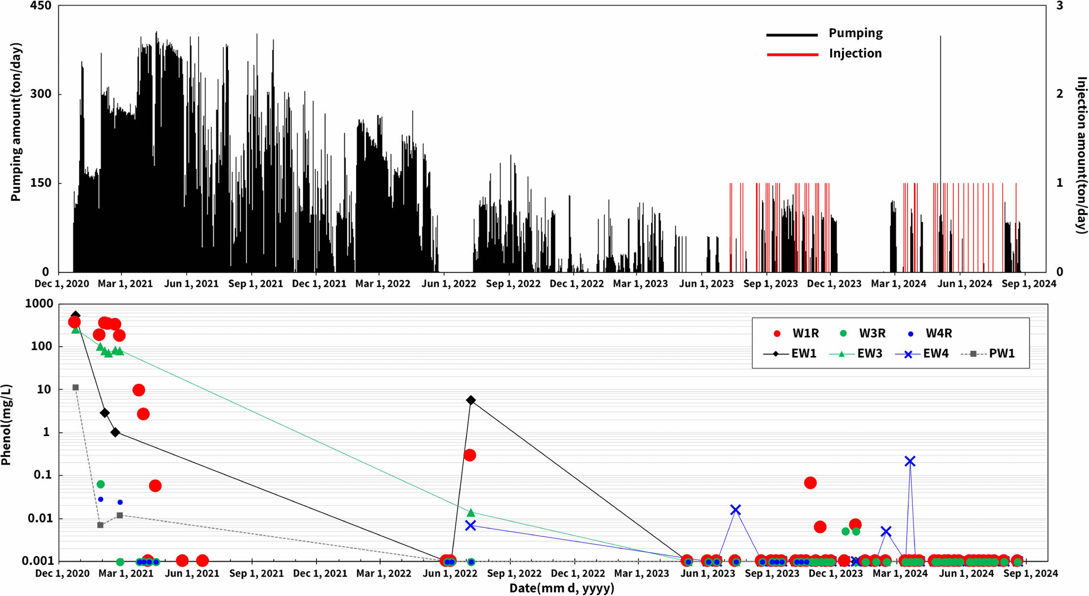 2020년과 2021년에는 긴급확산방지(emergency action) 조치로 양수정을 최대한 가동하여 W1R, EW1, EW3 지점에서 나타난 고농도 페놀을 신속히 저감하였다. 초기 농도는 W1R에서 356 mg/L, EW1R에서 535 mg/L, EW3R 258 mg/L 까지 측정되었다. 양수정의 지속적인 가동을 통해 농도가 많이 감소하였고, 2022년까지 대부분 지점에서 1 mg/L 이하로 검출되었다(Fig. 13).