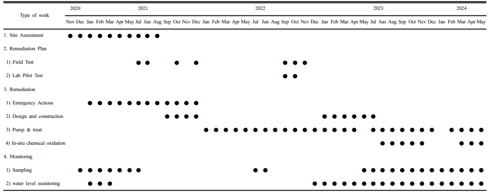 지하수 오염은 부지 내 공업용수로 이용하였던 암반 관정(PW)에서 페놀이 13.98 mg/L 검출되었다(Fig. 2). 현장 조사 등을 통해 확인된 오염원인으로는 인접한 노후 폐수 저장시설에서 오염수가 지하로 유출되어 주변 지하수가 오염된 것으로 조사되었다. Table 1은 각 작업이 언제 시작되고 종료되었는지를 시간대별로 명확하게 보여주며, 연구 진행 상황을 시각적으로 이해할 수 있다. 지하수 오염방지 명령을 시작으로 해서, 지하수 오염평가 및 정화계획을 수립하였고, 약 2년간 긴급확산방지와 함께 지하수 조사 및 정화 작업이 진행되었다. 그 과정에서 생성된 현장 자료를 수리지질학적으로 해석하였다. 지하수 오염평가는 2020년에서 2021년까지 주로 진행되었으며, 이 기간 동안 오염 조사와 긴급확산방지 조치가 수행되었다. 정화 계획 수립 단계에서는 2022년과 2023년에 걸쳐 현장 실험과 실내 실험이 진행되었으며, 이 과정에서 제안된 정화 방법의 효과성을 평가하였다. 현장 실험은 단계양수시험, 적정양수량 산정 등의 양수처리 공법에 필요한 운영 인자를 도출하였으며, 실내 실험에서는 화학적 산화공법 운영 시 필요한 오염물질에 따른 산화제 제거 효율, 반응시간 등을 검토하였다. 지하수 정화 작업은 2022년에 설계 및 시공이 집중적으로 이루어졌으며, 특히 과황산염을 사용한 in-situ 화학 산화 공법이 2023년 후반부터 2024년 초까지 적용되었다. 모니터링 작업은 2021년부터 시작되어 장기적인 수질 및 수위 변화 추적을 위한 샘플링과 수위 측정이 꾸준히 이루어졌다.