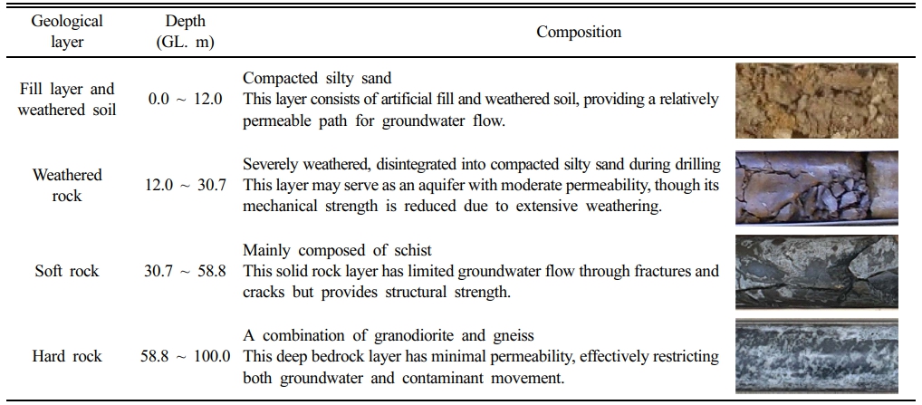Table 3은 NX1지점에서 시추 코어링 결과를 정리한 것이다. 연구 부지는 다양한 지질층이 혼재되어 있으며, 주요 구성 요소로 충적층, 풍화암층, 그리고 연암층, 경암층으로 구분된다. 충적층을 구성하고 있는 매립층과 풍화토 구간은 길지 않지만, 오염물질 유출이 최초로 발생한 구간이다. 이 구간은 암편이 섞인 실트질 모래로 구성되어 있어서, 중력과 긴급확산방지 양수 작업에 의해 풍화암층을 신속하게 이동한 것으로 판단된다. 풍화암층은 심한 풍화가 발생한 구간으로 높은 투수성을 가지고 있어 지하수의 흐름과 오염물질의 이동이 원활하게 이루어질 수 있다. 풍화암층 바로 하부에는 물질 이동이 어려운 연암층이 존재하는데 이 층은 풍화암층에 비해 상대적으로 단단한 암석층이며, 지하수 이동이 제한적이다. 하지만 균열을 통해 일부 지하수가 흐를 수 있다. 연암층 하부에 위치한 경암층은 화강섬록암과 편마암이 혼재된 단단한 암반층으로 지하수의 흐름이 거의 발생하지 않으며, 오염물질의 이동도 제한된다. 풍화암층은 오염물질이 이동하는 주요 대수층이고, 일부 연암층도 오염되었다. 따라서 풍화암층과 일부 연암층을 중심으로 정화전략이 수립되었다.