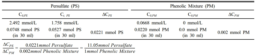 실내 실험 결과, 과황산염과 Fe2⁺의 농도를 각각 2.5 mM로 설정한 조건에서 페놀 제거율이 가장 높게 나타났다. 구체적으로, 2.5/2.5 mM 농도 조건에서는 약 99%의 페놀 제거율을 보였으며, 이 조건이 가장 효과적인 것으로 나타났다(Fig. 9). 이를 기반으로, 과황산염과 Fe2⁺의 농도를 2.5/2.5 mM로 고정하고 페놀 혼합물(농도: 6.284 mg/L)로 120분 동안 추가적인 kinetics 실험을 수행한 결과, 페놀 제거율은 100%에 도달하였고, 페놀 정점(peak)은 실험 시작 후 5분 이내에 완전히 제거되었다(Table 4). 또한, pH 제어 없이 진행된 실험에서 산화 후 최종 pH는 3.47로 낮아졌다. 이러한 결과는 과황산염/Fe2⁺ 시스템이 pH 변화에도 불구하고 높은 페놀 제거 성능을 유지할 수 있음을 보여주고 있다. 실내 실험에서 얻어진 결과는 과황산염과 Fe2⁺ 조합이 페놀로 오염된 지하수를 처리하는 데 있어 매우 효과적이라는 결과를 도출할 수 있었다. 또한 Table 4와 같이 1 mM 페놀 혼합 용액(phenol mixture water)을 처리하기 위해 11.05 mM 과황산염(PS)이 필요한 것으로 계산되었다. 현장에서 과황산염을 사용할 시에는 분해 반응을 통해 pH가 산성 환경으로 변할 수도 있으므로, 현장 운영을 통해 적정한 주입량을 고려해야 한다.