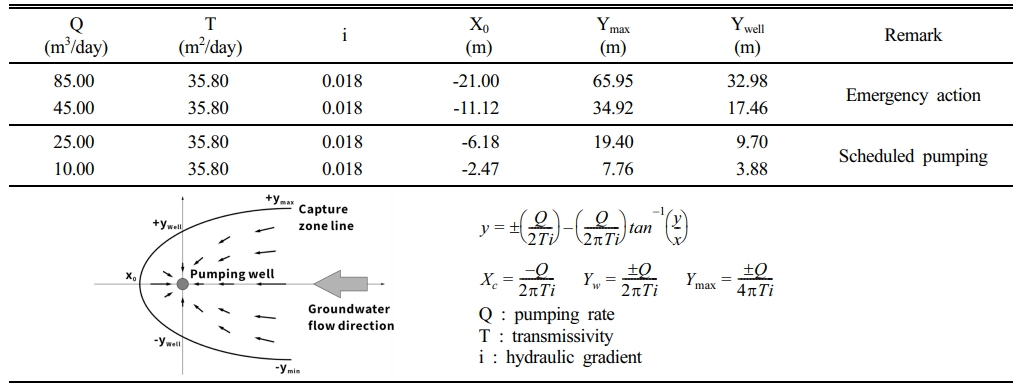 US EPA(2008)에 제시된 포획구간 범위 계산식(단공 양수정)을 통하여 본 대상지역의 포획구간 범위를 추정하는 관계식과 결과는 Table 6과 같다. Table 6과 같이 정화 대상부지에 대하여 각 구역별 현장수리시험을 통해 산출된 수리특성값인 투수량계수(T)와 수리경사(i)와 더불어 설계양수량(Q) 값을 대입하여 구역별 포획구간을 산정하였다. 2021년 긴급확산방지 조치로 운영된 양수량은 약 45 ~ 85 m3/day였다. 이때 발생하는 포획구간의 최대폭은 약 70 ~ 130 m로 산출되었다. 이들 값들은 구역별 양수정 위치 선정 시 상류로부터 하류(외부)로 유출되는 오염물질 확산을 최소화하도록 운영되었다. 긴급확산방지 조치 이후부터는 적정양수량과 포획구간을 반영해서 양수정 운영계획을 마련하였다. 최대 양수량으로 양수하게 되면 수처리 비용이 과중하게 되어 지속적으로 운영에는 한계가 있기 때문이다. 오염원 주변 하나의 양수정이 약 10 ~ 20 m의 포획구간을 발생시키면 오염물질을 포획할 수 있다. 따라서, Table 6에 10, 25 m3/day의 포획구간을 계산하였고, 이 양수량이 양수처리 공법 운영 전략에 반영되었다.