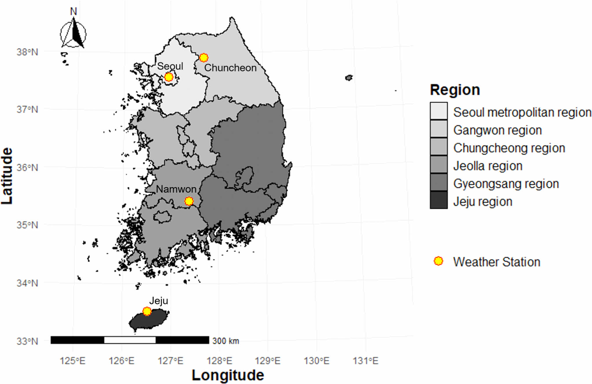 최근 30년간 서울의 연평균 강우량은 1448.3 mm이며, 여름철 강우량은 915.2 mm로 연 강우량의 약 63.2%에 해당하며, 반대로 겨울철 강우량은 연 강우량의 4.5%인 65.8 mm에 불과하다. 춘천의 연평균 강우량은 1371.0 mm이며, 연 강우량의 약 63%를 차지하는 857.6 mm의 강우가 여름철에 집중되며, 겨울철 강우량은 67.3 mm로 연 강우량의 약 5%를 차지한다. 남원의 연평균 강우량은 1386.2 mm이며, 여름철과 겨울철의 강우량은 796.3 mm (약 57%)와 99.4 mm(약 7%)이다. 같은 기간 제주의 연평균 강우량은 1492.2 mm로 다른 지역에 비해 많은 강우량을 보였다. 여름철과 겨울철 강우량은 각각 629.2 mm와 186.1 mm로 연 강우량의 약 42%와 약 12%에 해당한다. 제주는 연중 해양성 기후의 영향을 받기 때문에 다른 지역에 비해 낮은 계절별 강우량 변동을 보인다(Korea Meteorological Administration, 2025).