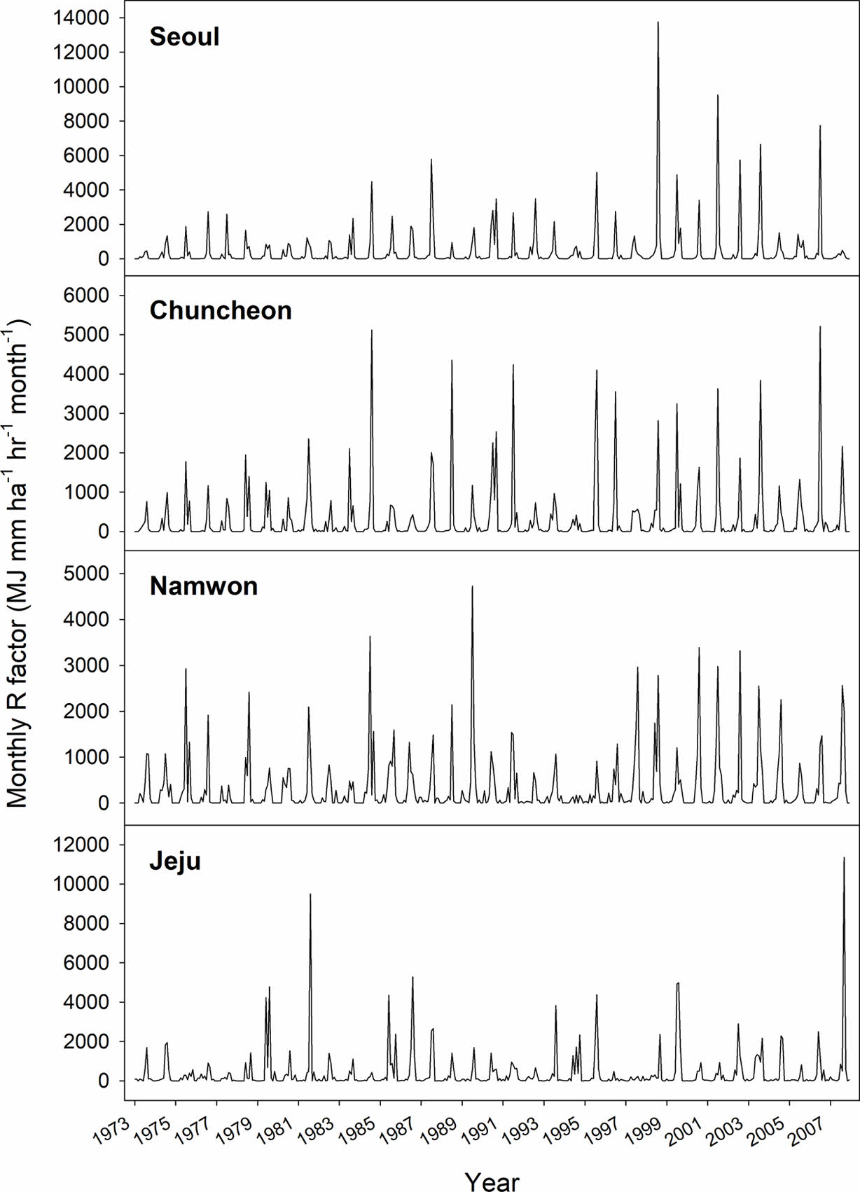 한국은 북위 33o – 38o에 위치하여 온대몬순기후대(temperate monsoon climate zone)의 특성을 갖는다. 기상청의 기후통계에 따르면 한국의 평균 연 강우량은 1306.3 mm이며, 동아시아 몬순에 의해 연 강우량의 약 54%에 해당하는 710.9 mm의 강우가 여름철에 집중되는 형태를 보인다. 본 연구에서는 서울, 춘천, 남원, 제주의 기상 관측소에서 측정된 강우 데이터를 이용하여 지역별 R factor를 예측하였다(Fig. 1).