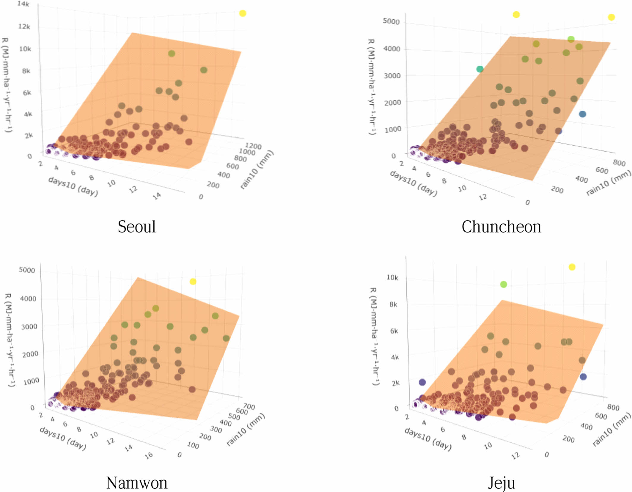 Fig. 3 Scatter plot of monthly R factor estimated from rain10 and days10 in Seoul, Chuncheon, Namwon, and Jeju. The orange planes represent R factors estimated using the model proposed by Loureriro and Coutinho (2001). |