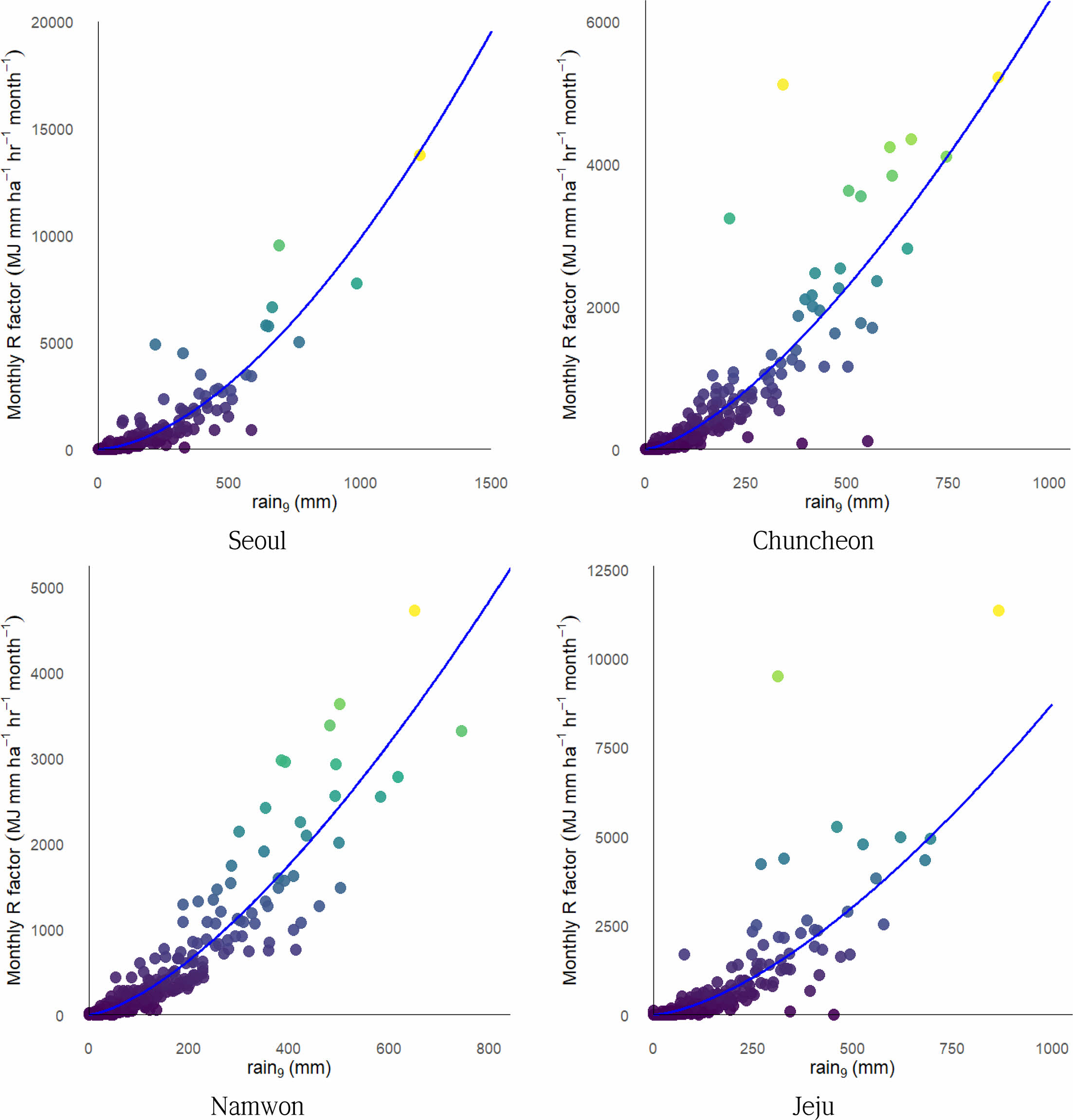 Fig. 4 Scatter plot of monthly R factor estimated from rain9 in Seoul, Chuncheon, Namwon, and Jeju. The blue lines represent R factors estimated using the model proposed by Fu et al. (2005). |