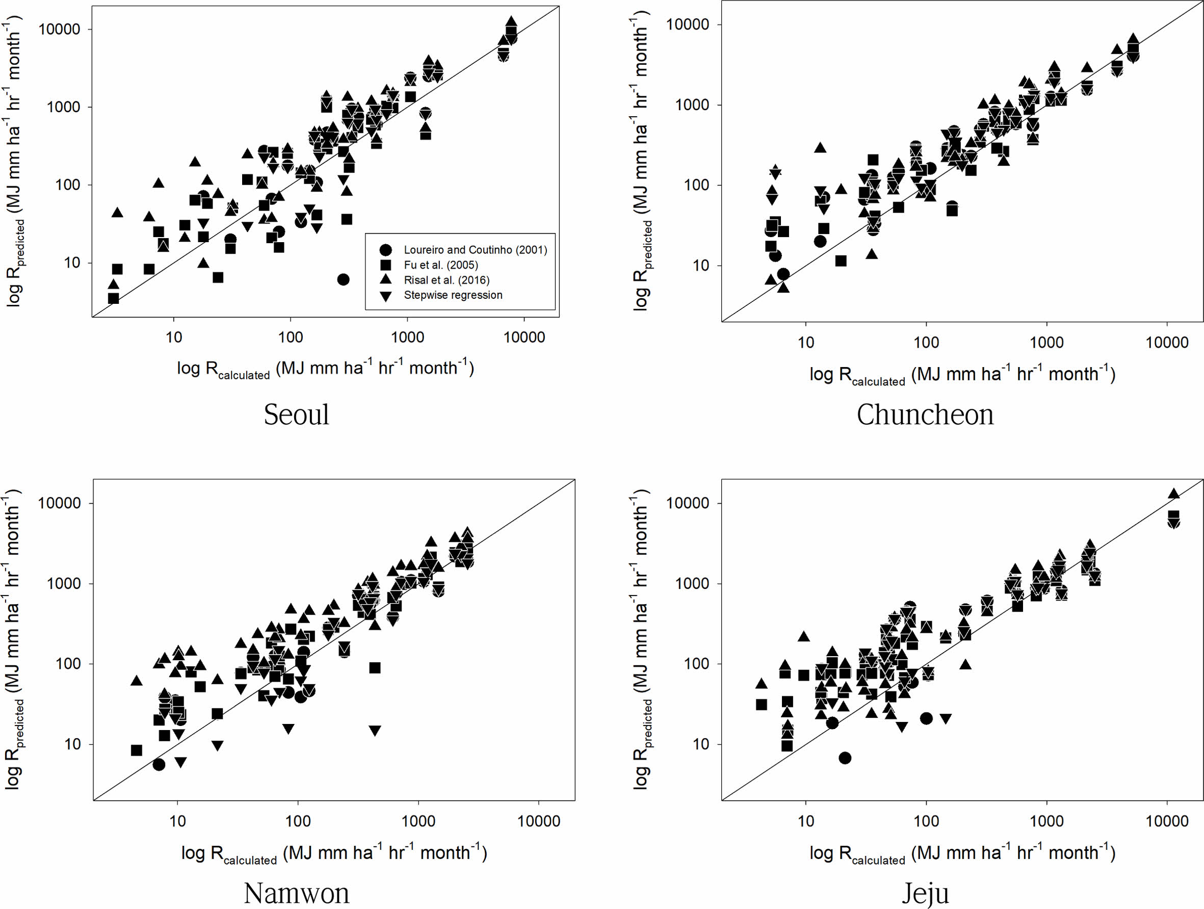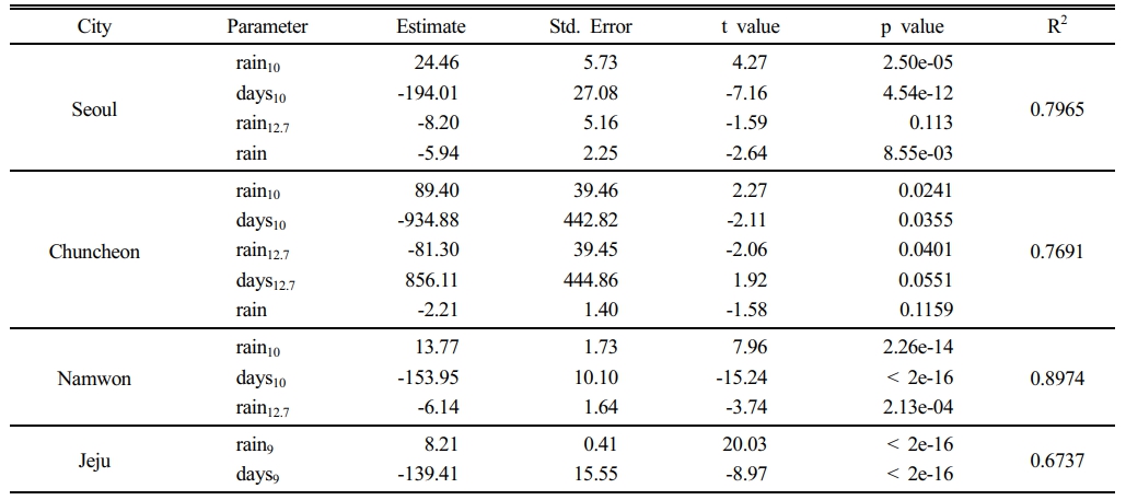 Table 3은 4개 지역에서 수행된 stepwise regression 결과를 보여준다. Stepwise regression은 전진 선택(forward selection)과 후진 제거(backward elimination)를 동시에 적용하여 계산된 Akaike Information Criterion (AIC)를 비교하는 방법으로 수행되었다. Stepwise regression model에서 상수항은 0으로 가정하였다. 서울, 춘천, 남원에서 공통으로 rain10과 days10 변수가 선택되었다. 특히, 이 변수들은 세 개 지역에서 공통으로 95% 유의수준에서 유의한 것으로 평가되었으며, Louriero and Coutinho(2001)이 제안한 모형에서 사용되는 변수와 동일하다. 반면에 제주에서는 rain9와 days9 변수가 선택되었다. 국내에서 토양 침식에 대한 유효 강우의 기준을 통일하기 위해 서울, 춘천, 남원에서 공통으로 선별된 rain10과 days10 변수를 국내 지역에 대한 월별 R factor 추정 모형의 변수로 결정하였다. 이는 Louriero and Coutinho(2001)의 모형의 국내 적용이 타당함을 보여주며, Table 1에 따르면 제주 지역에서도 통계적으로 높은 유의성을 보였다. 이러한 결과는 국내에서 토양 침식을 유발하는 유효 강우의 기준으로 일강우량 10 mm 이상인 강우 사건을 적용하는 것이 타당하다.