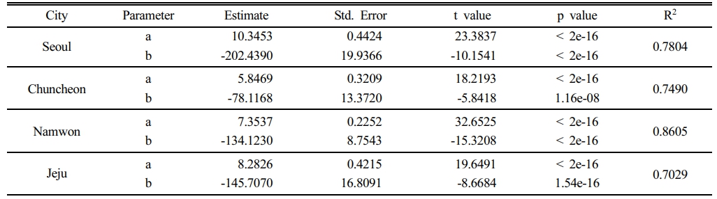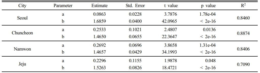 본 연구에서는 기존 모형(Loureiro and Coutinho, 2001; Fu et al., 2005)에 4개 지역에서 측정된 30년간 강우 변수를 입력하여 R factor를 추정하였다. Table 1과 Table 2는 각각 Loureiro and Coutinho(2001)와 Fu et al.(2005)이 제안한 모형을 이용한 회귀 분석 결과를 보여준다.
