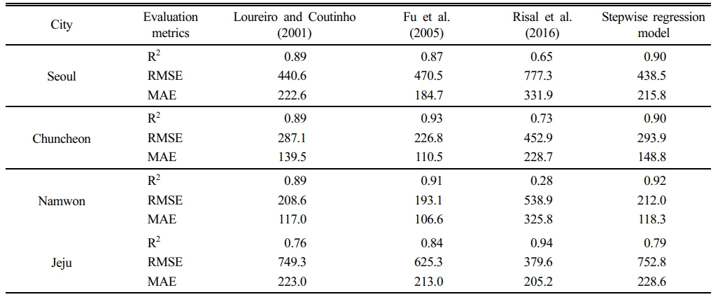 Table 4 Validation results of regression models for monthly R estimation in Seoul, Chuncheon, Namwon, and Jeju |