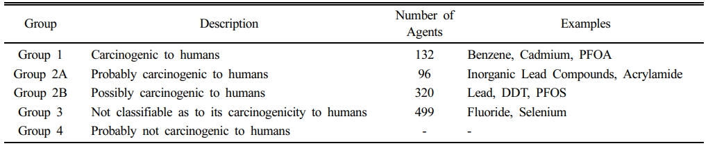 국제암연구소인 IARC(International Agency for Research on Cancer)에서는 발암성 위험을 체계적으로 평가하기 위해 연구 물질을 5가지 그룹으로 나눈다(Table 2)(IARC, 2025). 그중, PFOA는 Group 1의 발암성 물질로 분류하며, PFOS는 Group 2B의 발암 가능성이 있는 물질에 해당한다.
