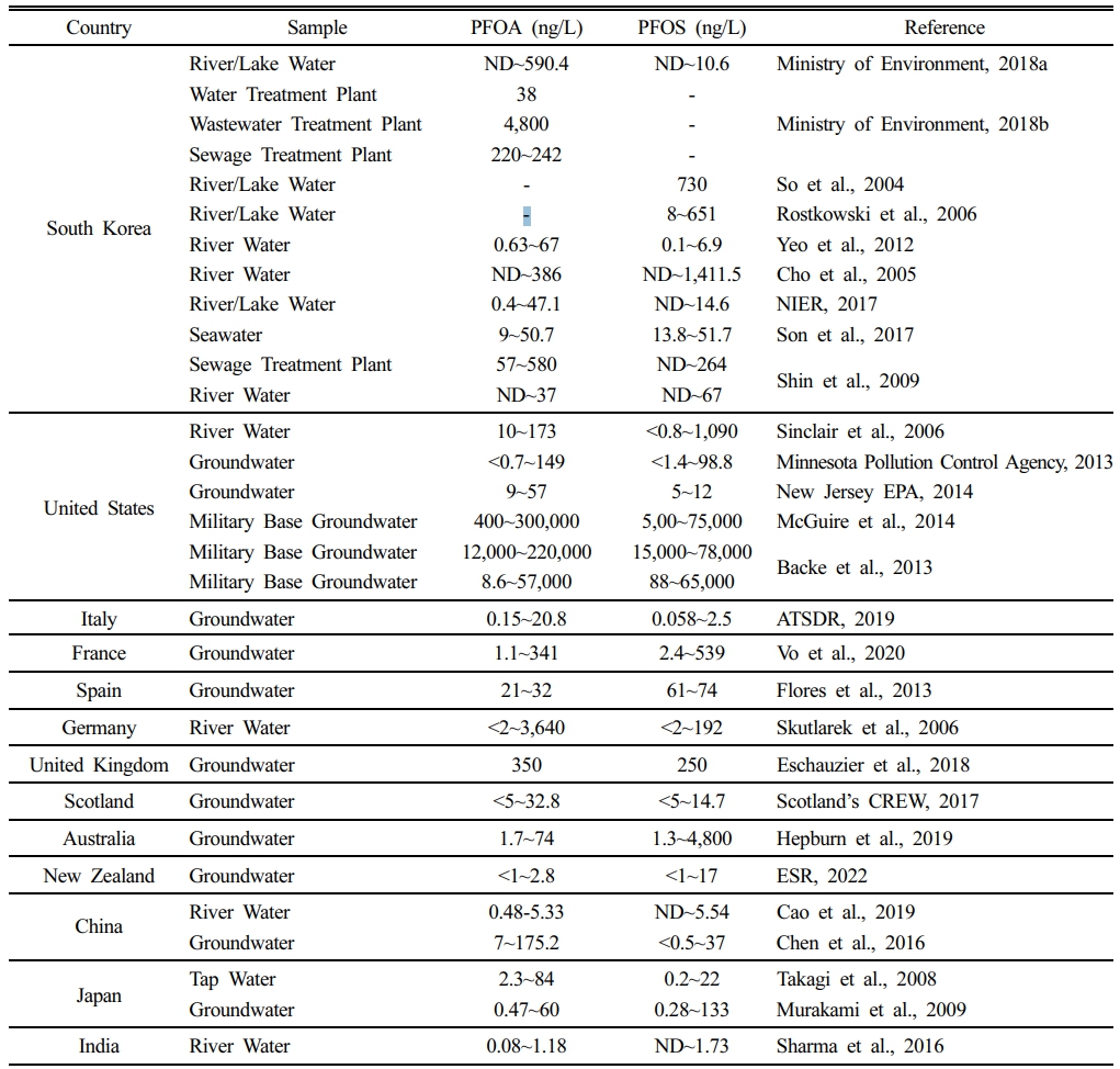 과불화화합물은 세계적으로 하천, 호소수, 지하수 등 다양한 수생환경에서 검출되고 있는 것으로 확인되었다. 특히, 산업단지 및 미군기지 등 일부 특정지역에서 지하수 중 과불화화합물이 높은 수준으로 나타나고 있으며, 국내·외 관리수준을 초과하는 사례가 다수 확인되고 있다. Table 4는 문헌조사를 통해 얻은 과불화화합물의 국내·외 검출사례를 정리한 자료이다.