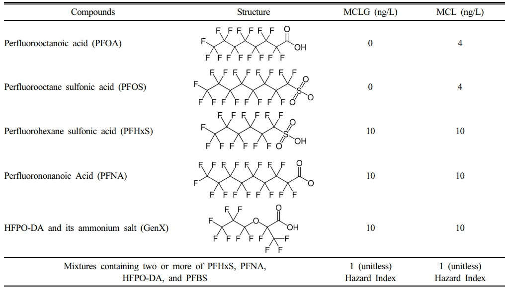 미국 EPA는 2024년 4월 10일 국가 음용수 규정(NPDWR)을 발표하였다. 음용수 내 과불화화합물의 관리를 위해 법적으로 제제 가능한 최대 오염 허용치를 4~10 ng/L로 설정하였으며, 과불화화합물의 관리를 통해 나아가야할 최대 오염 허용 목표치를 0~10 ng/L로 발표하였다. 최대 오염 허용치와 최대 오염 허용 목표치에 해당하는 항목은 PFOA, PFOS, PFHxS, PFNA, HFPO-DA 및 두 종류 이상의 과불화화합물(PFHxS, PFNA, HFPO-DA, PFBS)이다(Table 5) (EPA, 2025). 2027년까지 과불화화합물에 대한 초기 모니터링을 진행하고, 이후 지속적인 규정을 준수하는 모니터링을 지속해야 한다. 모니터링 결과가 최대 오염 허용치를 초과할 경우 2029년까지 저감조치를 취해야한다. 또한 2029년부터 음용수에서 최대 오염 허용치 중 하나 이상을 초과하는 경우, 과불화화합물 농도 저감 조치를 실시하고 위반 사실을 공고하여야 한다.