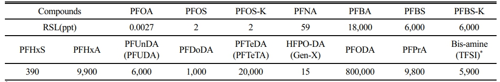 미국 ITRC는 지하수, 먹는물, 지표수 등에 대한 과불화화합물 설정 기준을 각 주별(30개주) 및 나라별(12개국)로 정리하였다. 그 중 대표적으로 미국 EPA는 지하수에 대하여 총 16개의 항목의 RSL 기준(2025)을 설정하여 관리 중이다(Table 6)(ITRC, 2025).